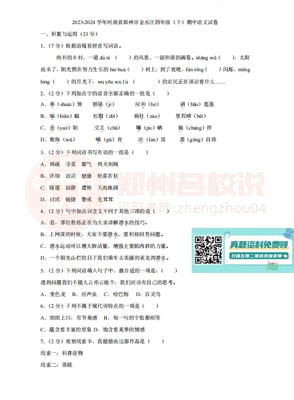 【期中真题】金水区五年级下学期期中语文试卷2024-2025学年
