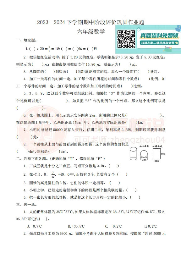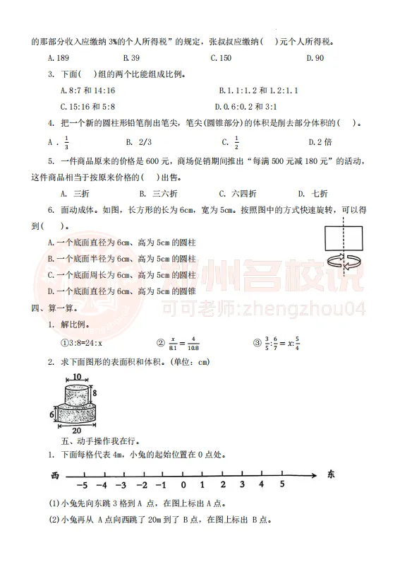 >【期中真题】金水区六年级下学期期中数学试卷2024-2025学年