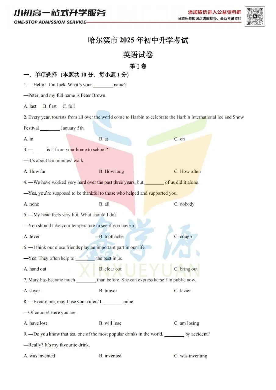>2025年哈尔滨英语中考真题试卷
