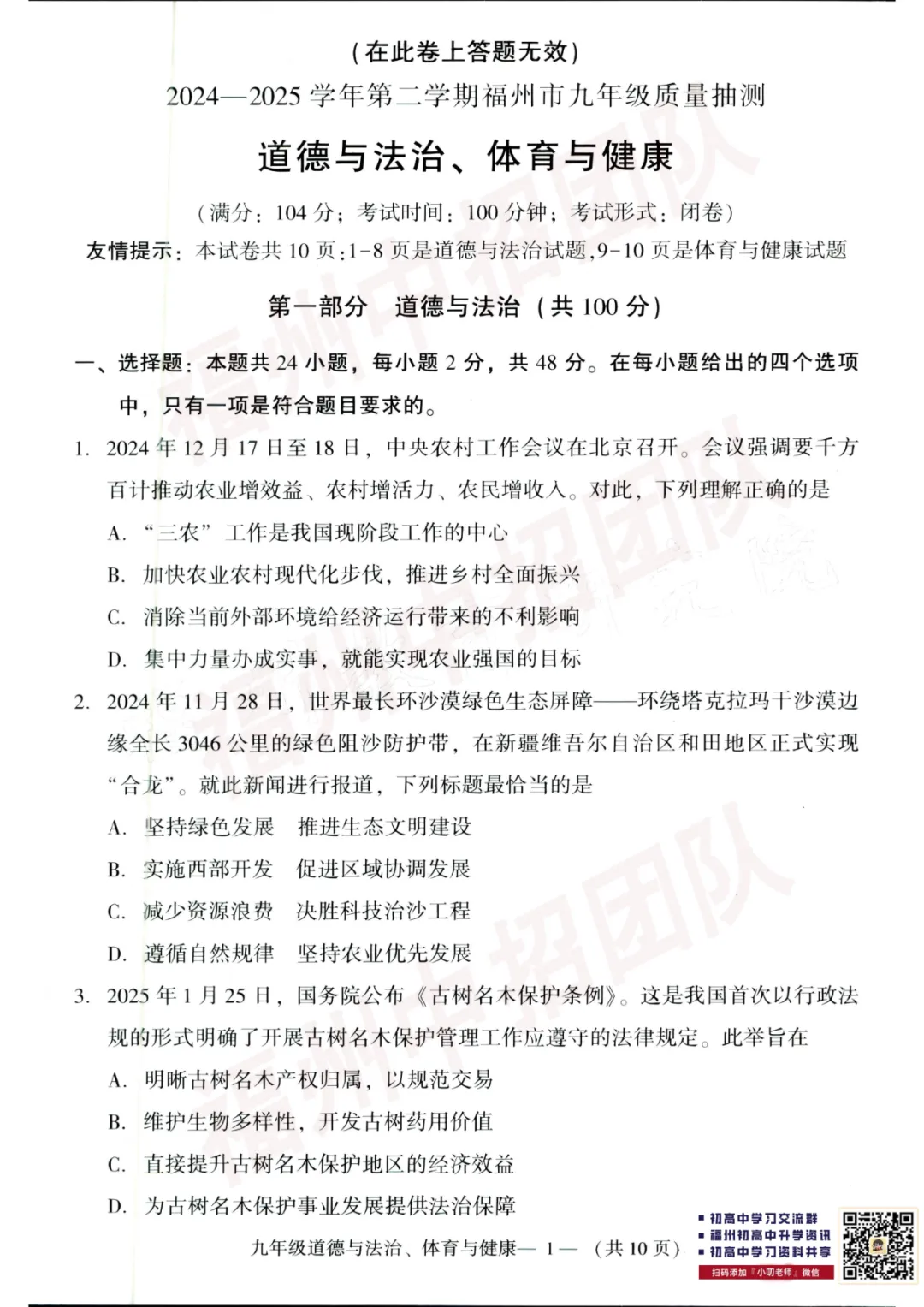【试卷分享】2024-2025学年福州市初三二检真题卷