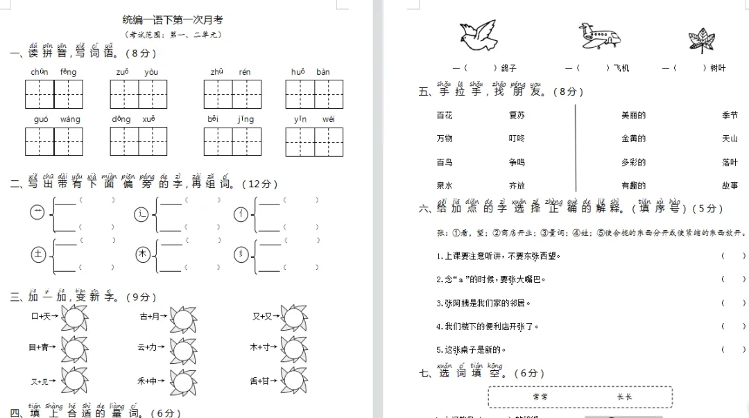 一( )鸽子 一( )飞机 一( )树叶
