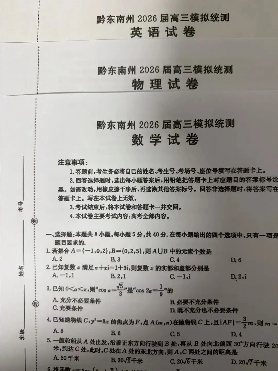考试名称:黔东南州一模黔东南州2026届高三模拟统测