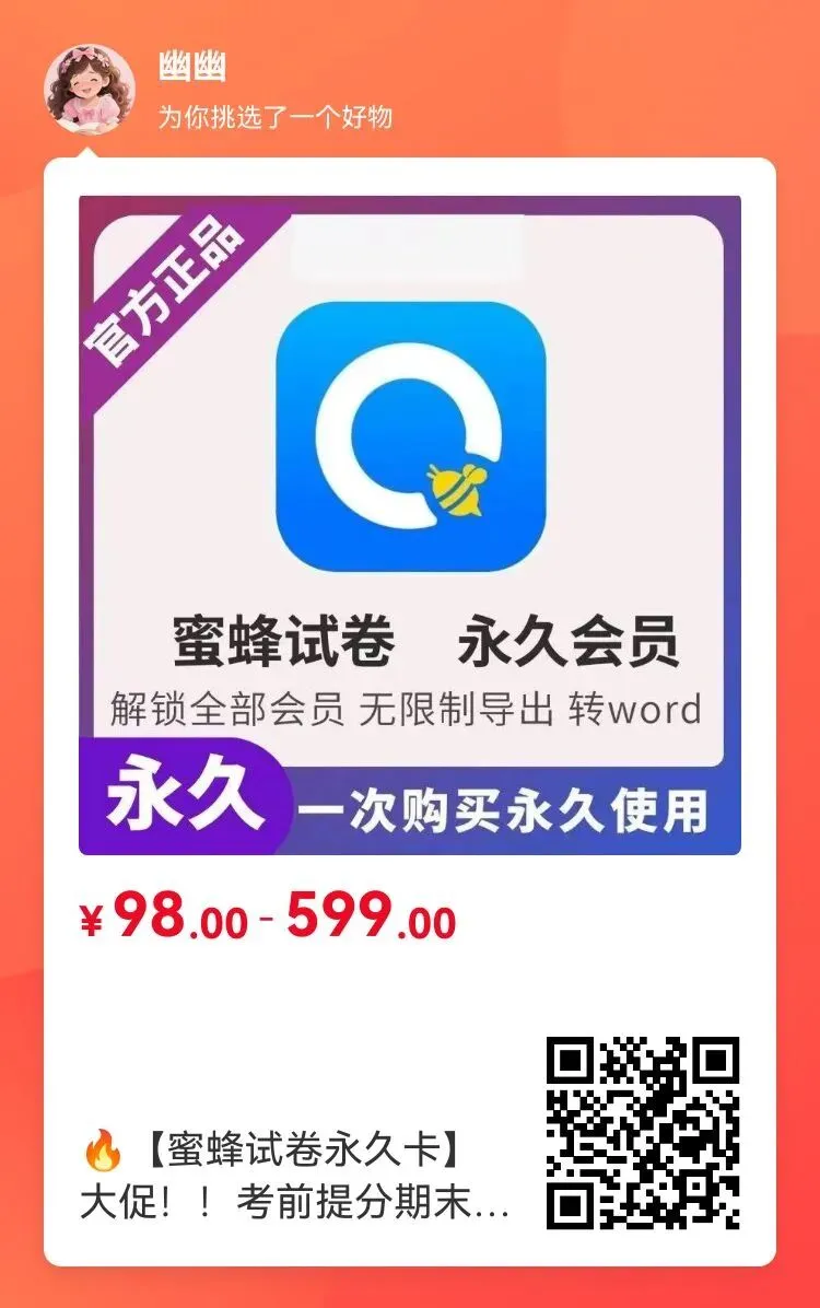 兑换方式:下单后联系客服要兑换码下载蜜蜂试卷APP--会员权益兑换--输入兑换码核心功能: