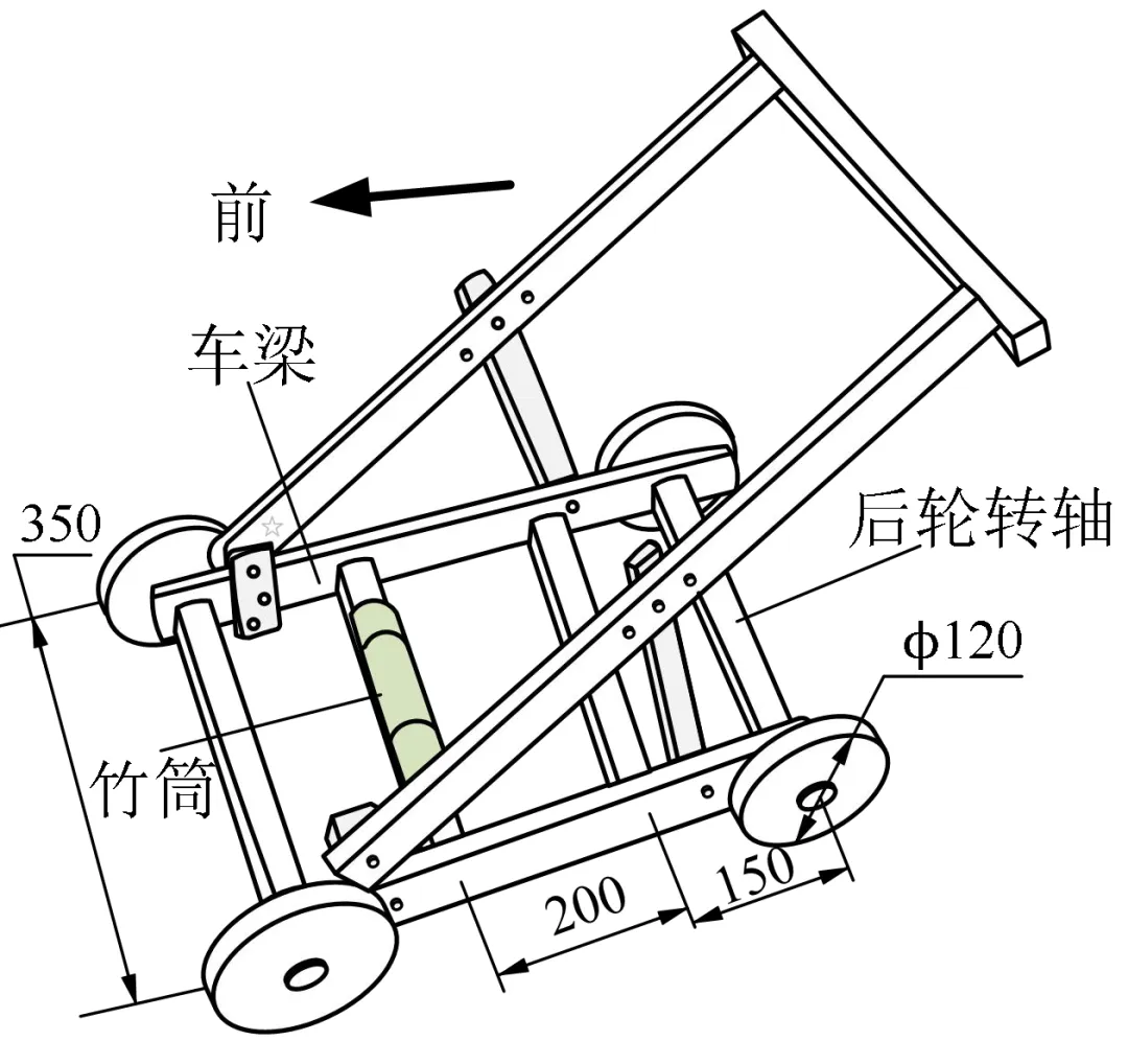 30.为提升学步车的趣味性,小明计划在原学步车基础上加装一套由后轮转轴驱动的敲击发声装置。该装置需实现:当学步车前进时,通过后轮转轴带动两根敲击杆交替敲击安装在底座上的竹筒,发出规律声响;学步车后退或无需发声时,可手动调节使敲击杆停止敲击。竹筒已固定安装,其位置与主要尺寸见图示。请帮助小明设计该装置。设计要求如下: