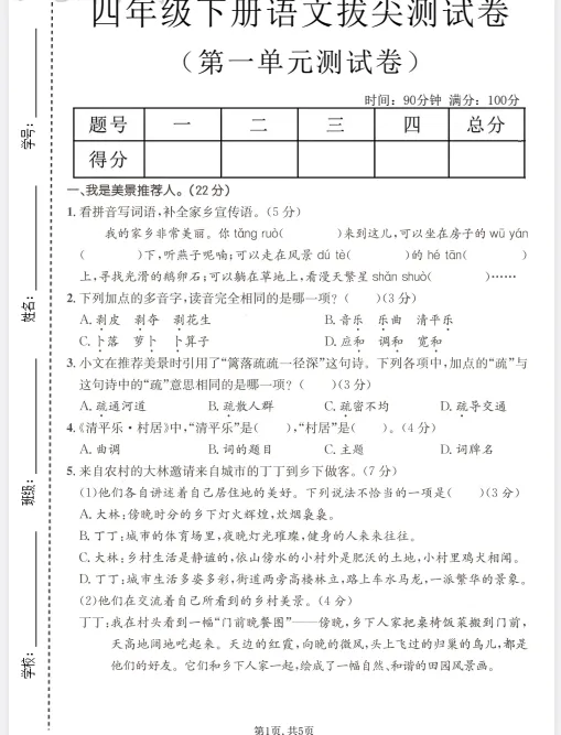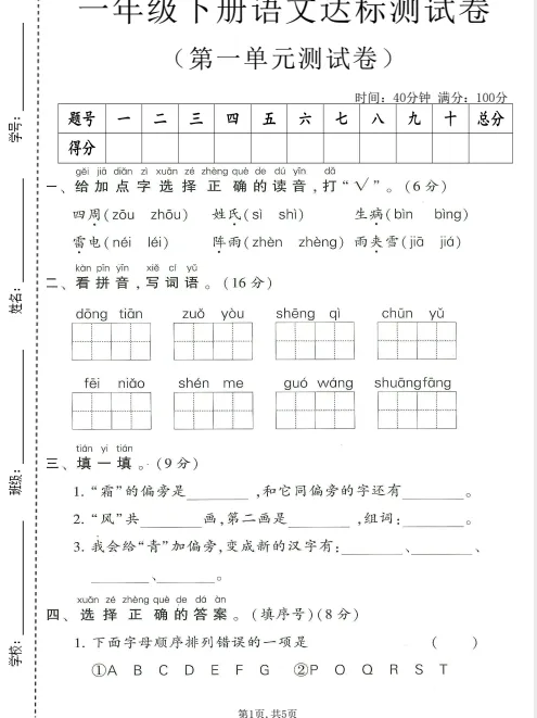 「26年春1-6年级下册语文第一单元测试卷」