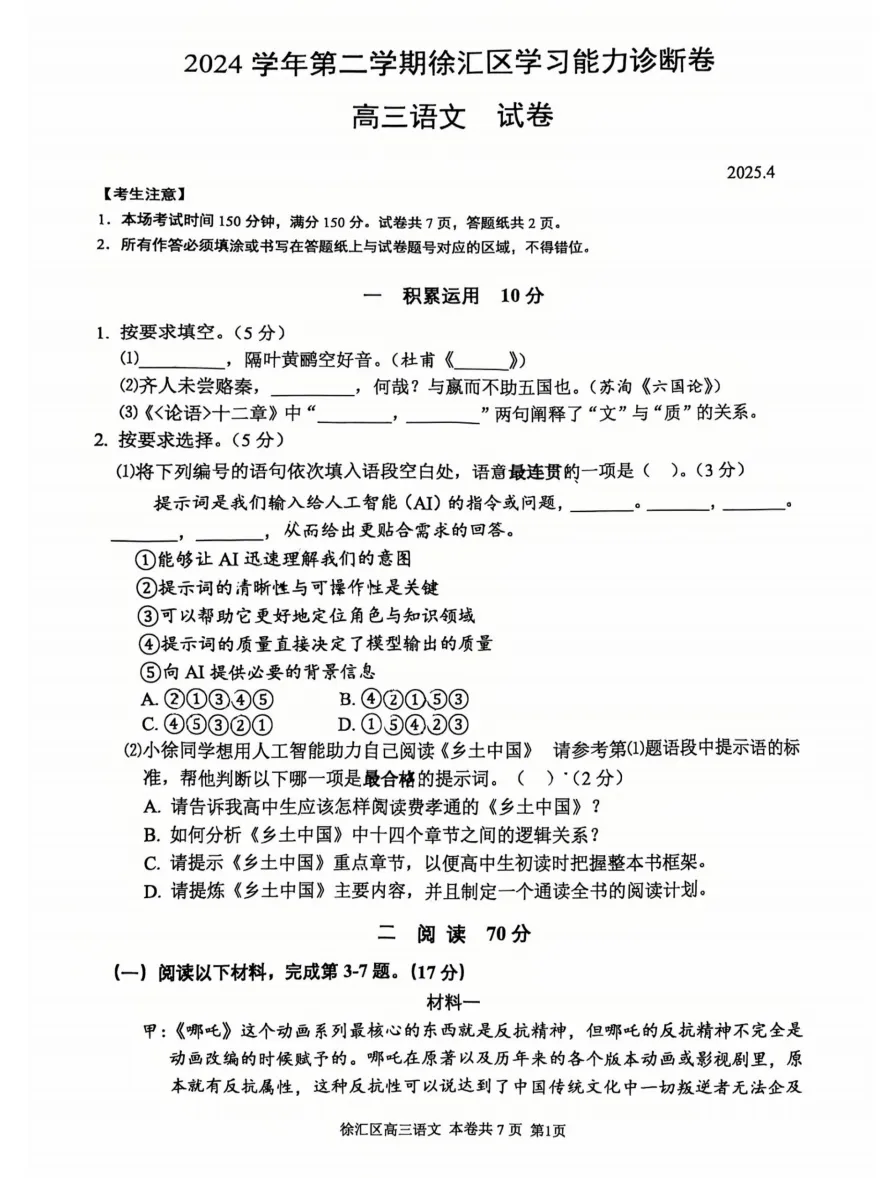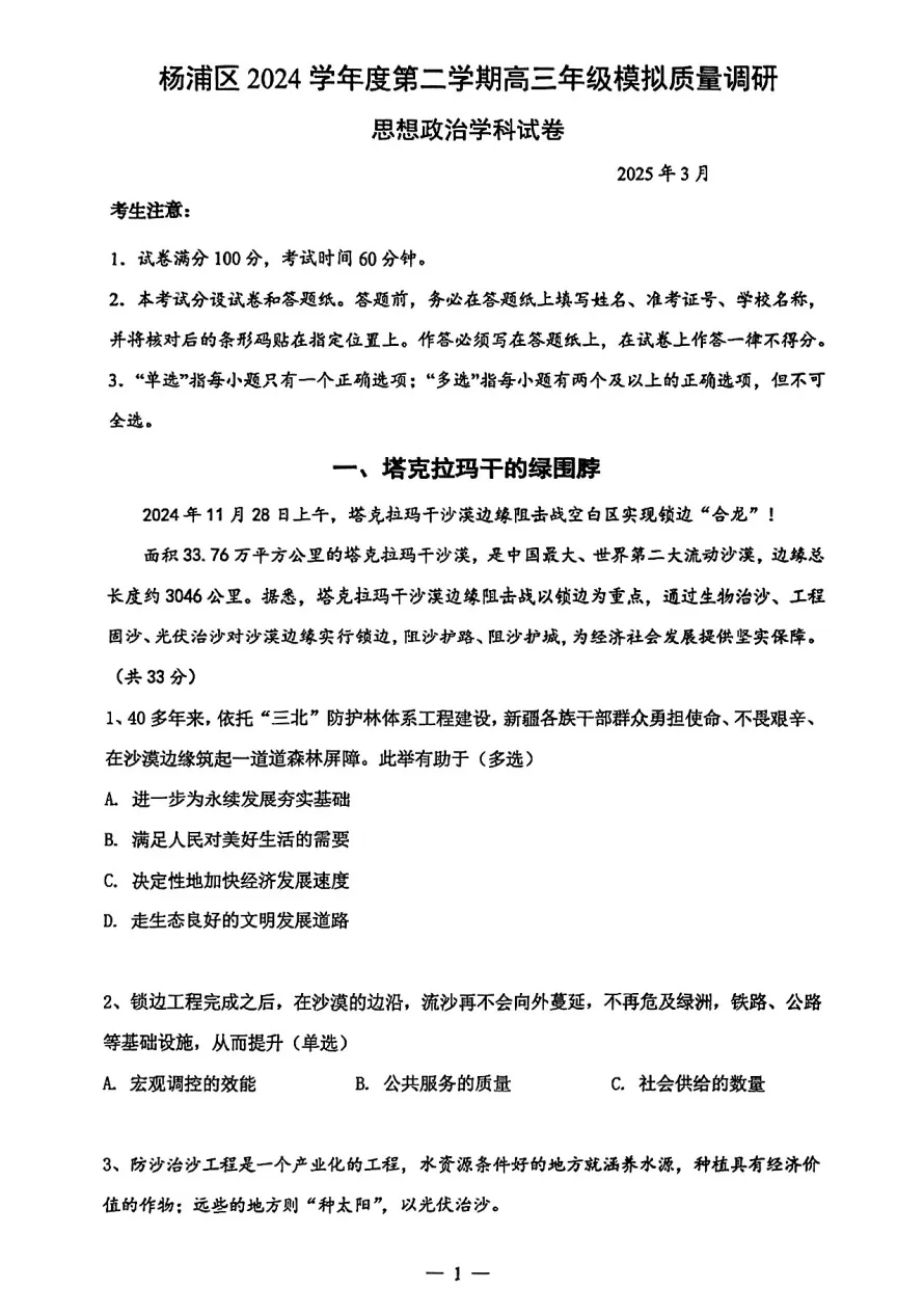 上海2025高三二模试卷及答案