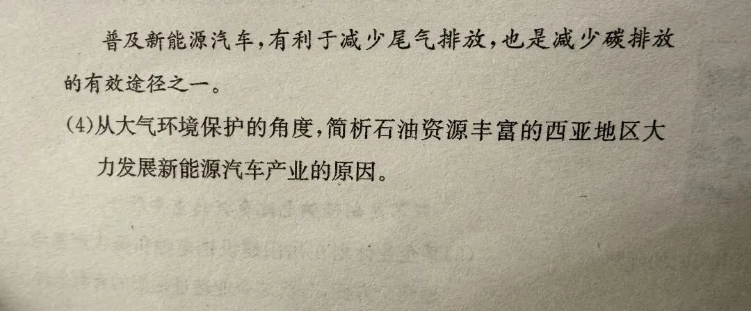 题目询问发展新能源汽车产业的原因,材料中早已将核心优势清晰呈现,学生只需精准摘抄关键句,再补充一句“有利于保护大气环境”,就能完整拿分。可现实中,不少学生被密密麻麻的材料“劝退”,直接空题放弃。家长们总以为这类“读材料就能得分”的题目是少数,实则这才是开卷地理的主流题型。