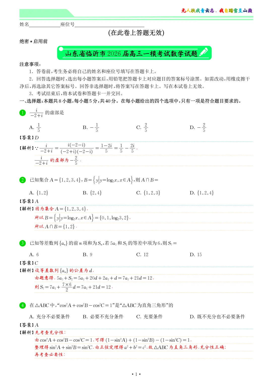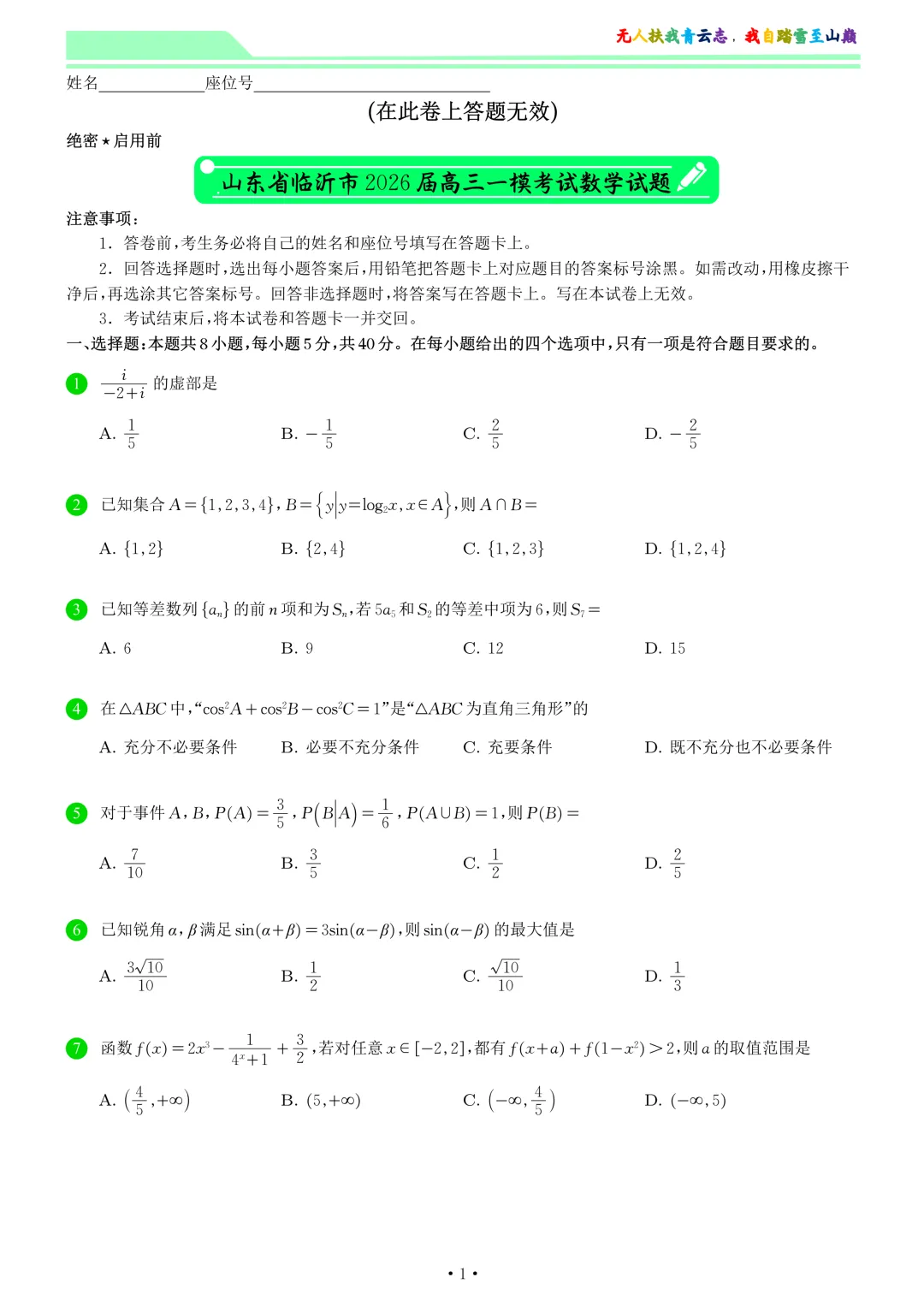 >山东省临沂市2026届高三一模考试数学试卷和答案
