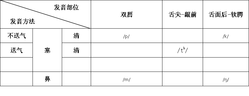 原题:请把/p/、/th/、/k/、/m/、/ŋ/五个音位填入下列音位聚合矩阵图。(复制此表)