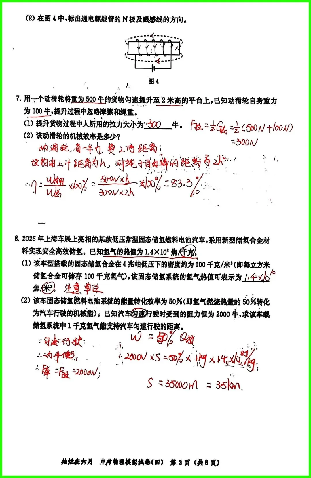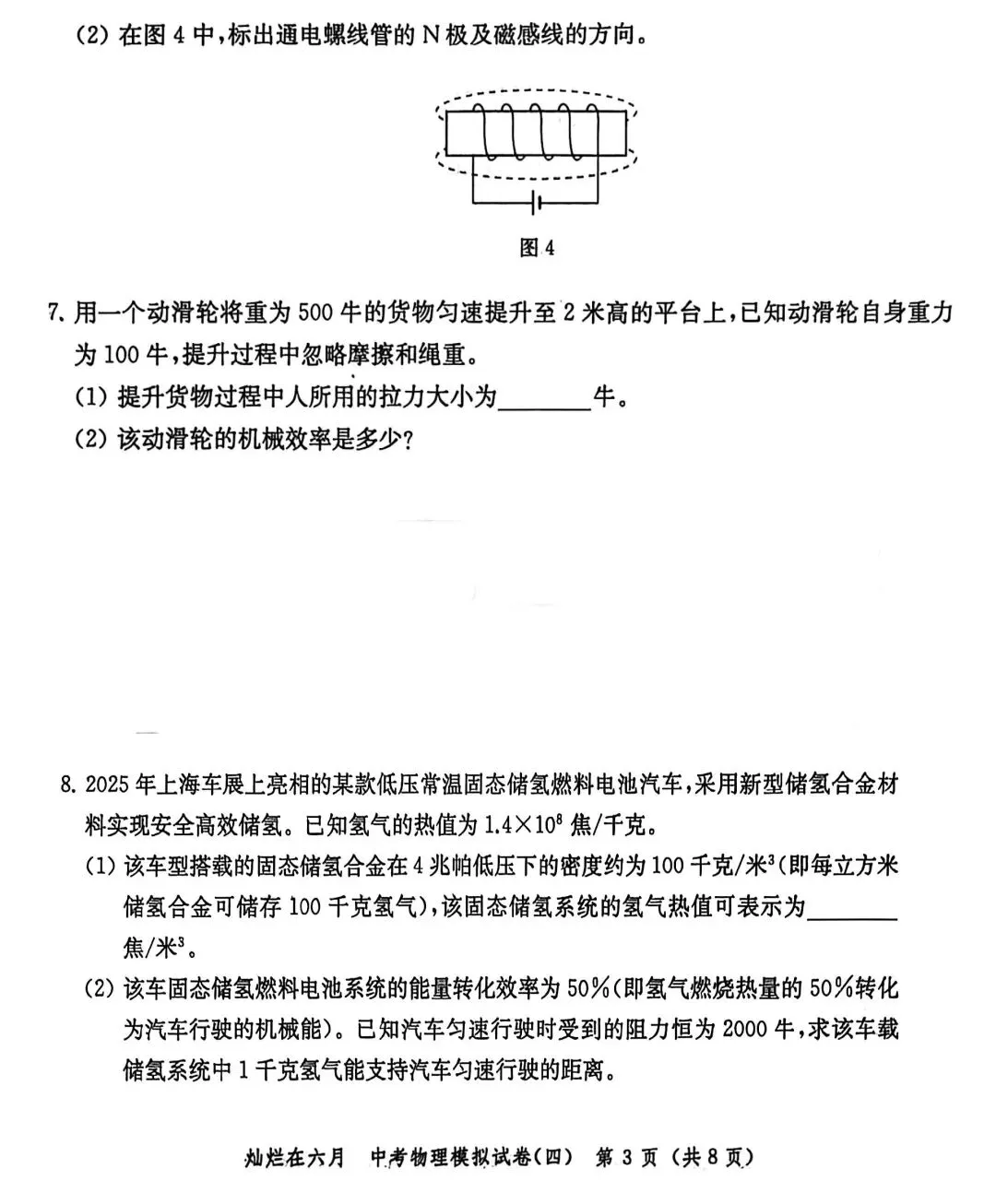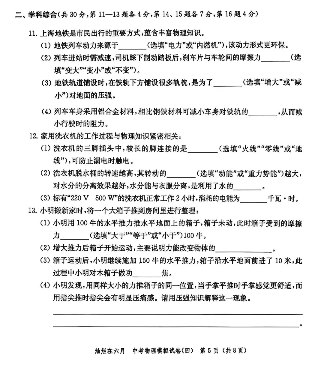 这是26版灿烂在六月试卷4,试卷考查知识点较全面,难度中等偏上。其中有些题很是新颖,如第8题气体热值的判断,需要注意从单位角度入手,算是一个小陷阱,估计不少人会掉进坑里;14题电学计算题,电路图的综合,将电学与杠杆结合,第三小问很是具有挑战性;15题压强计算题,属于“题狠字不多”,直接开干吧。 (试卷如下)