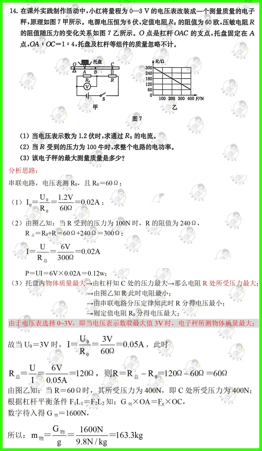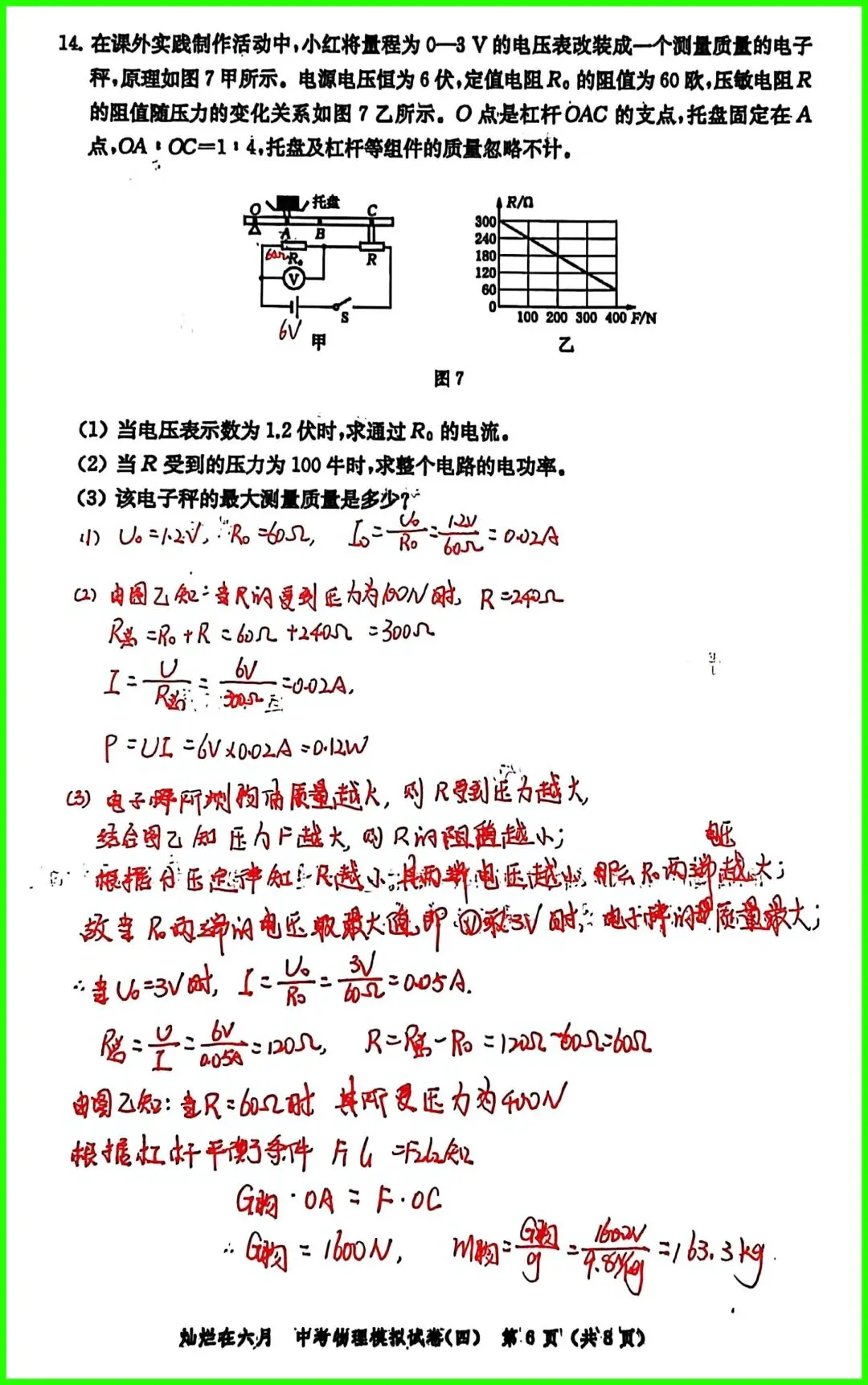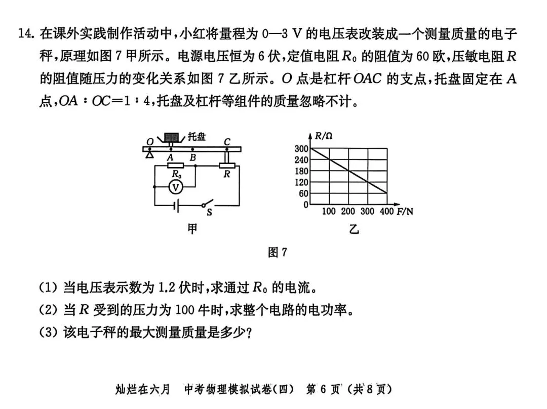 第14题:电学计算题,第三问将电学计算与杠杆平衡原理相结合,考查知识点较为丰富,很值得一练;