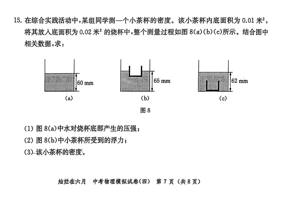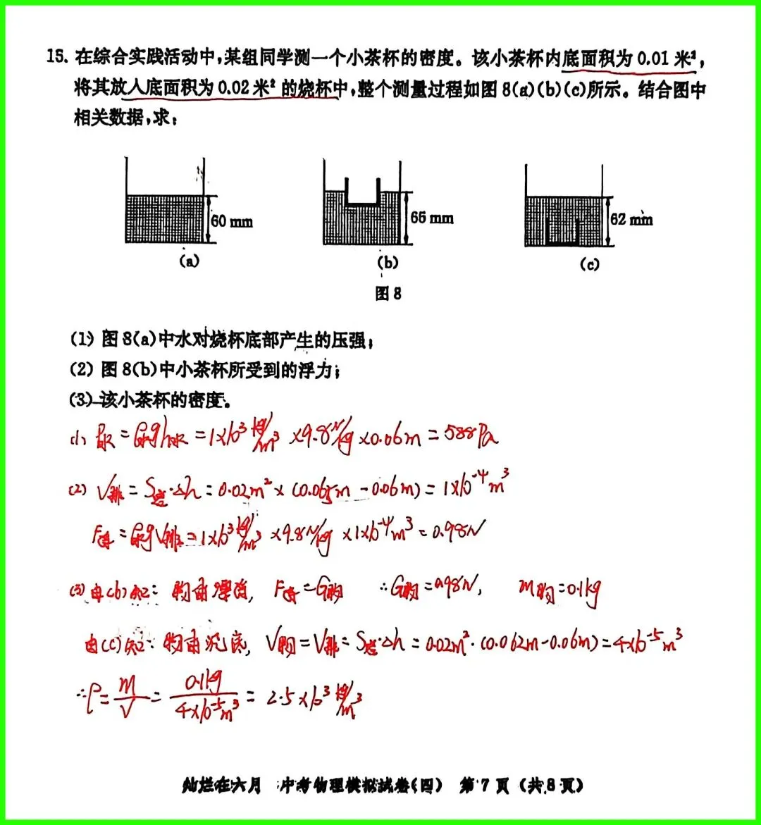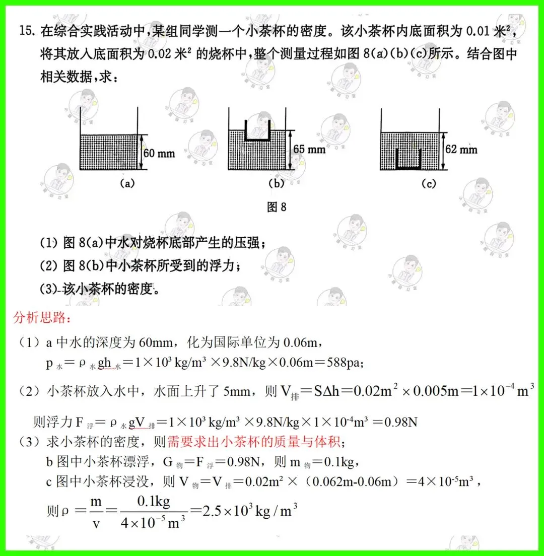 第15题:压强计算题,题目文字介绍很少,关键内容需要看图分析;理解物体放入液体中V排的判断;