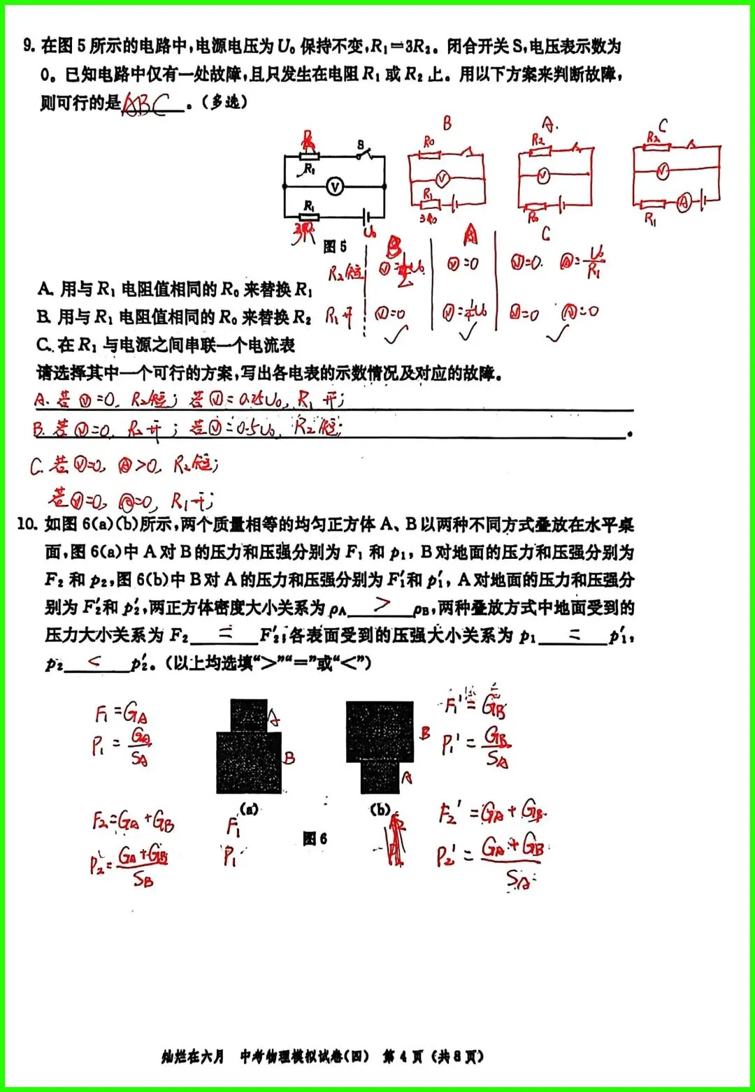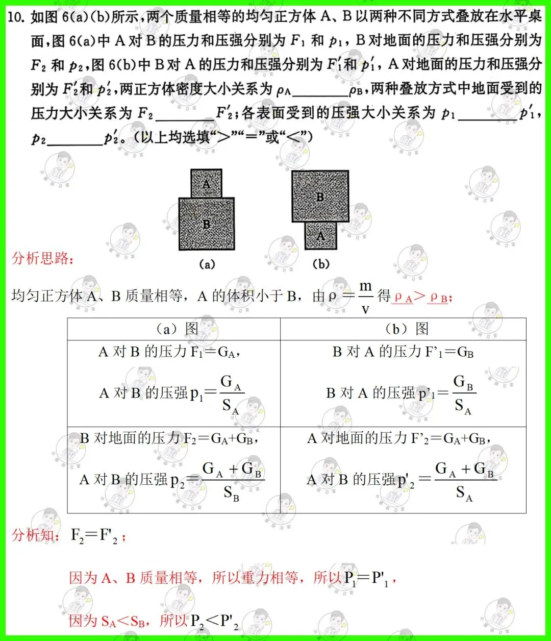 第10题: 固体压强的叠加计算,理解公式p=F/S中每个物理量的含义,重点理解S为受力面积或者接触面积;