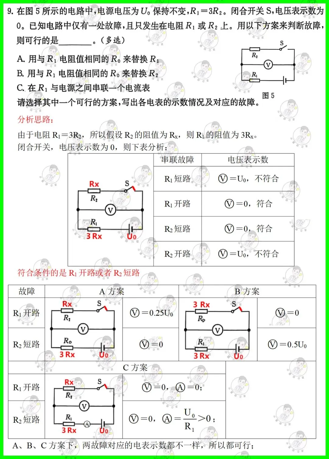 第9题:电路故障题,存在多方案选择,难度不大,直接根据方案画电路图分析即可;