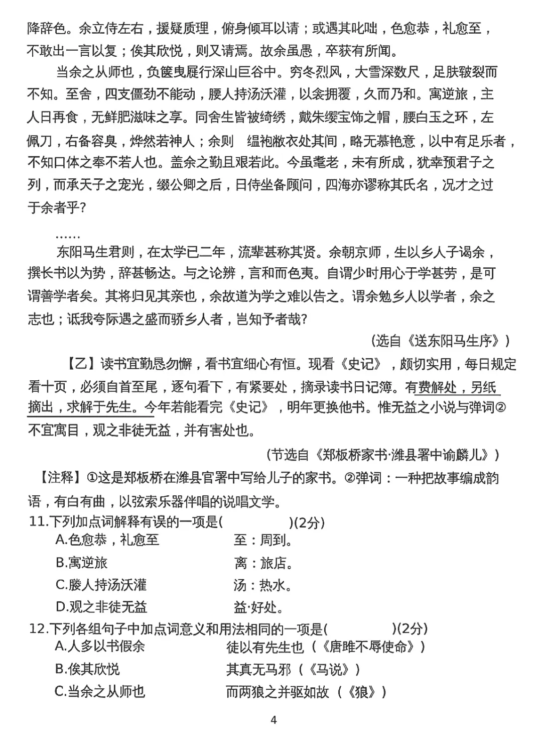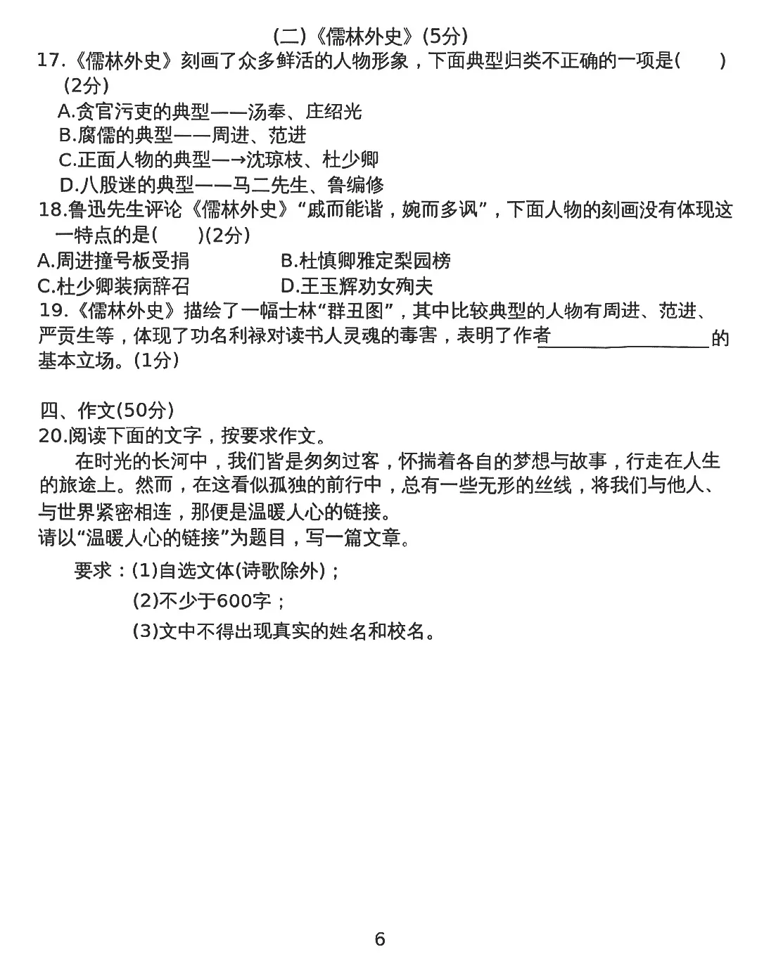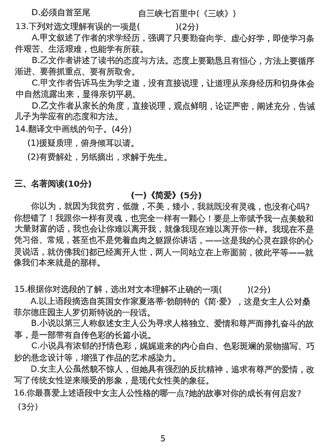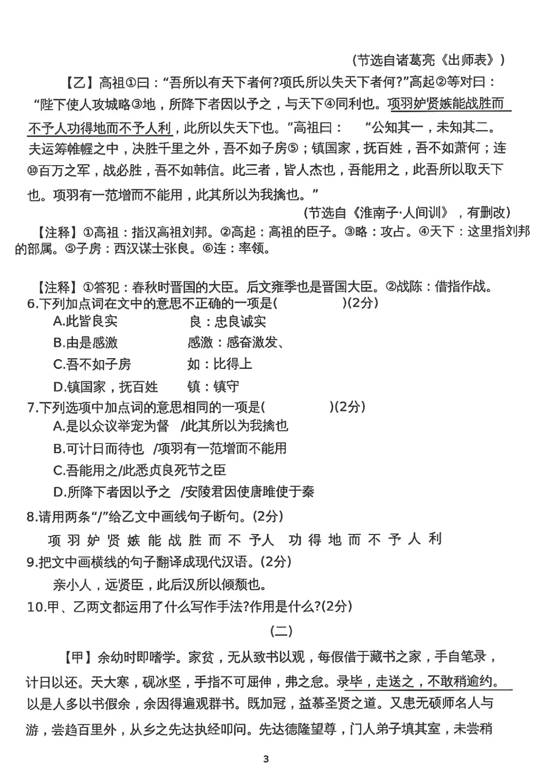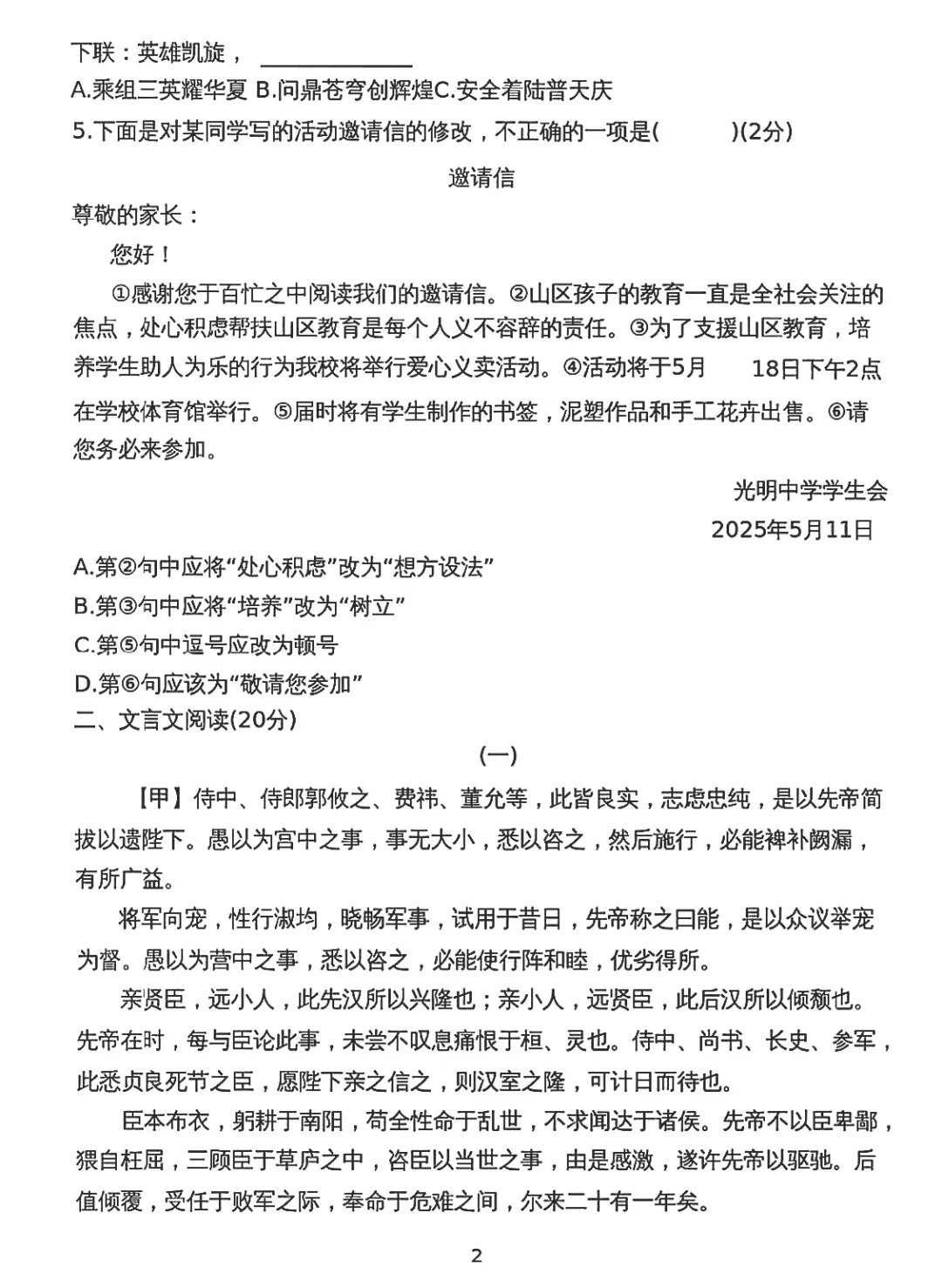 珠海市文园中学2025—2026学年九年级下学期语文开学收心自测试卷