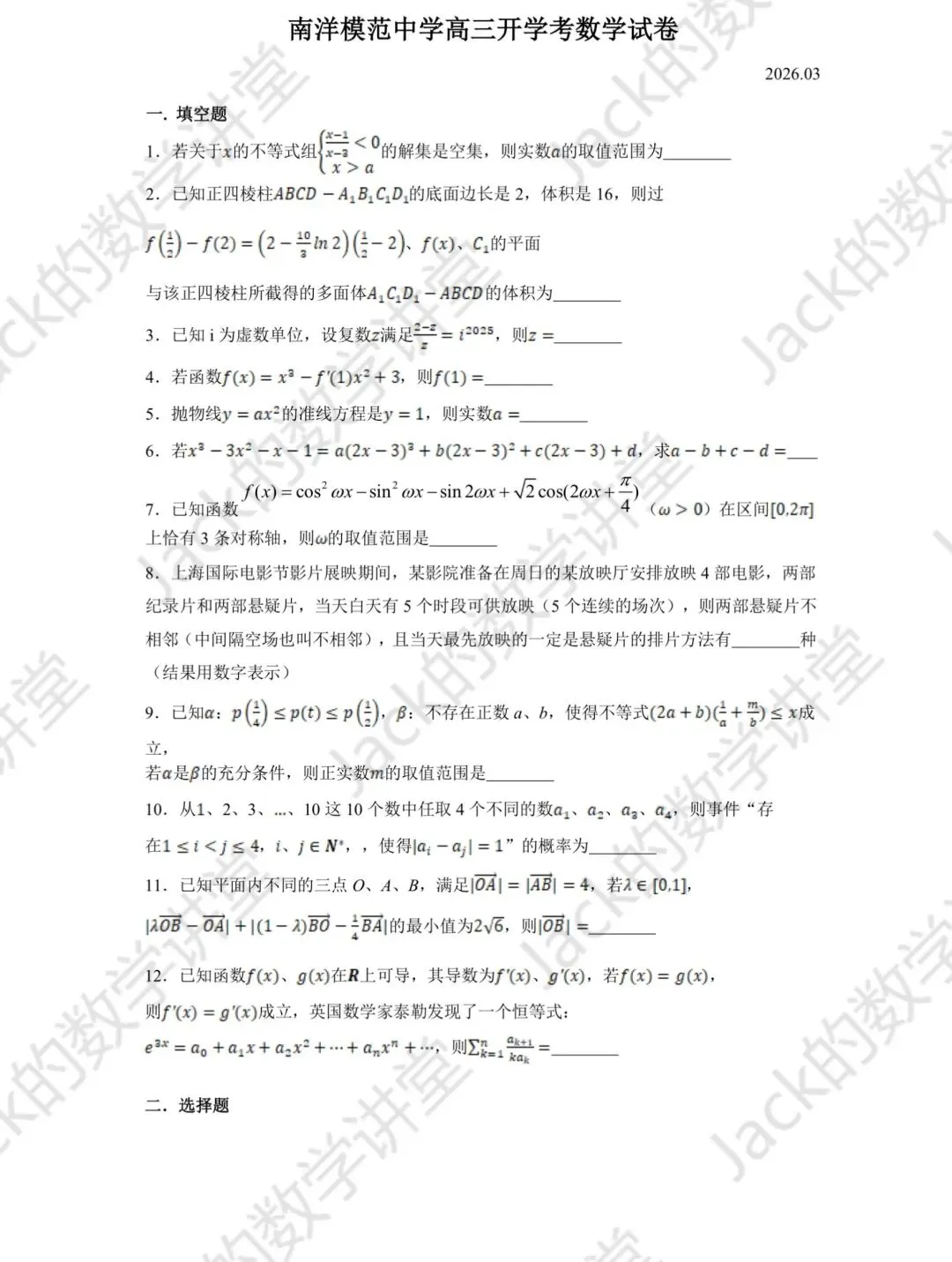 >【试卷分享】2026春南模高三开学考试