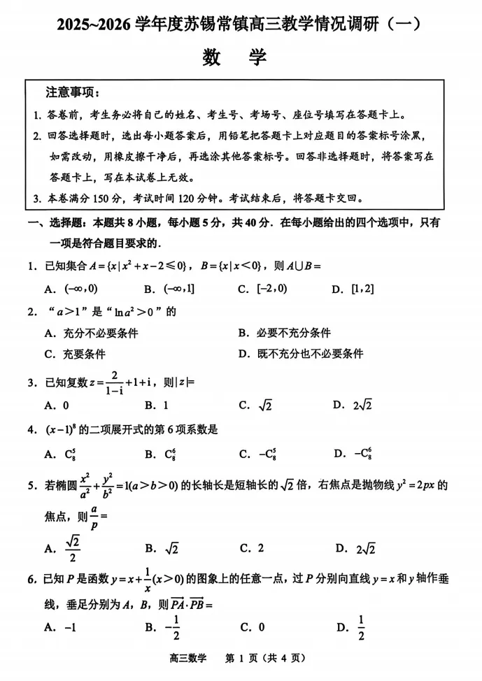 一模||2026年苏锡常镇一模试卷解析