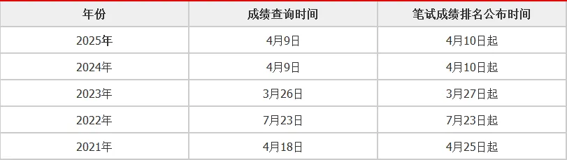 根据往年笔试成绩公布时间来看,一般在4月中旬(以下是近5年成绩查询时间)