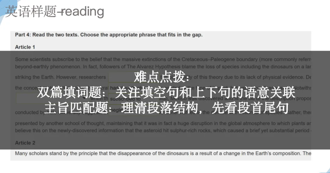 错误答案常常:无中生有、答非所问(答案不错但不符合要求)、过分绝对(always、often、 absolutely、completely,no+名词)、扩大了题目范围或过于具体。不要被选项中的错误信息、过多的修饰语带偏当无法区分选项的时候,画好关键词,比较异同点,再回到文本中比对。