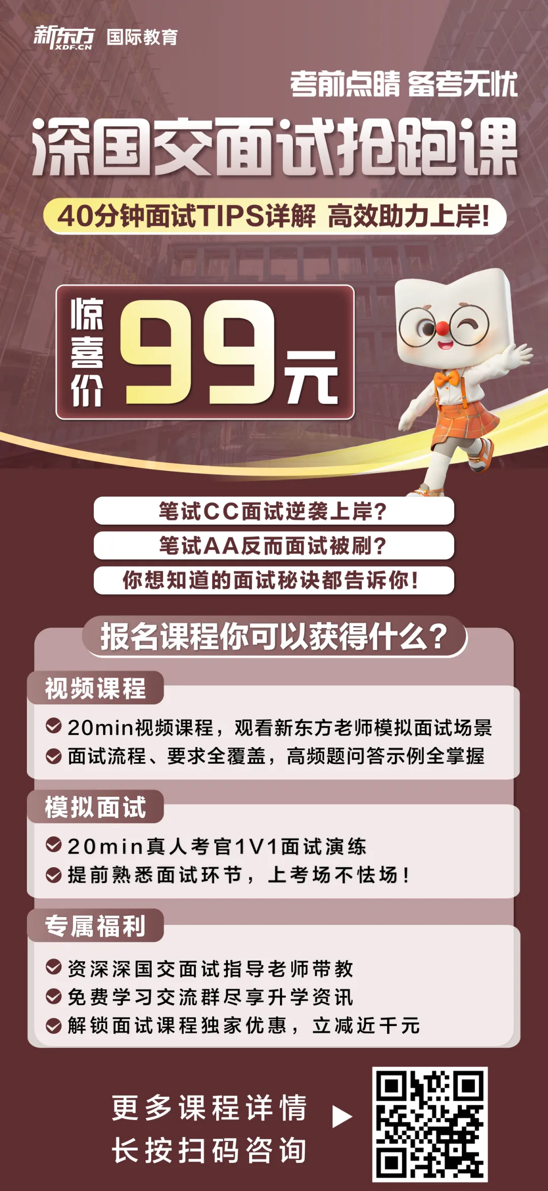 另外,3月入学考「面试考核」时间已确定3月29日!我们新东方国际教育推出【面试抢跑课】限时99元,课程内容包含: