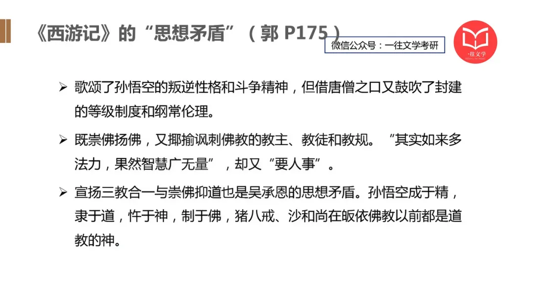 比如讲到《西游记》的主题,我们会把主流教材的精华悉数呈献:郭预衡先生着重于作者在崇佛与排道、叛逆与封建等级制度间的“思想矛盾”;袁行霈先生则从“心学”角度切入,将其视为“明心见性”的哲理探讨;而马工程与南开版本则分别补充了“游戏笔墨中暗传密谛”的艺术特质,以及“反抗压抑与向往自由”的群体精神内涵。
