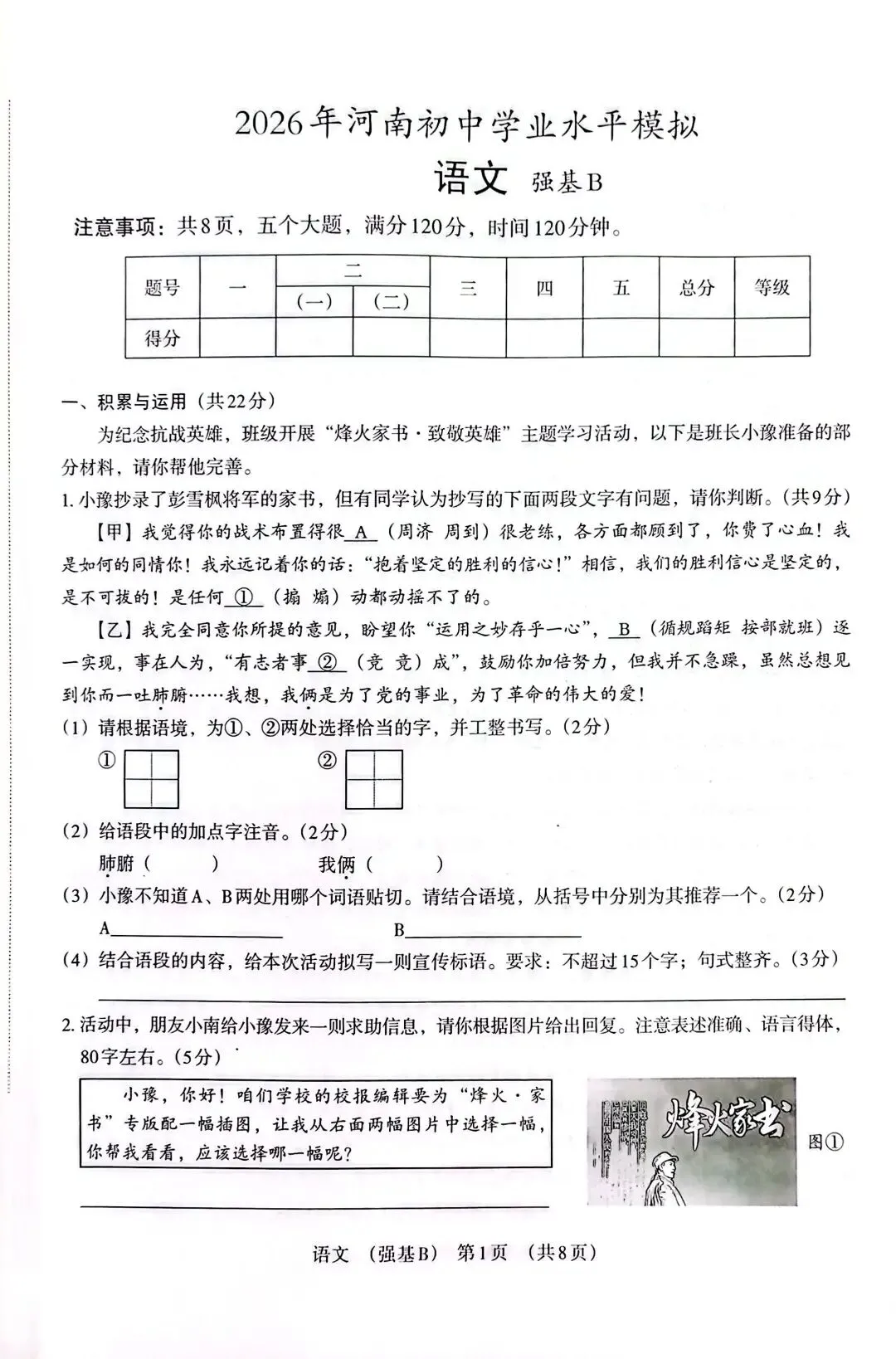 积累与运用(22分):以“烽火家书·致敬英雄”主题活动串联,将字词、标点、古诗文默写、口语交际融为一体,避免碎片化考查。