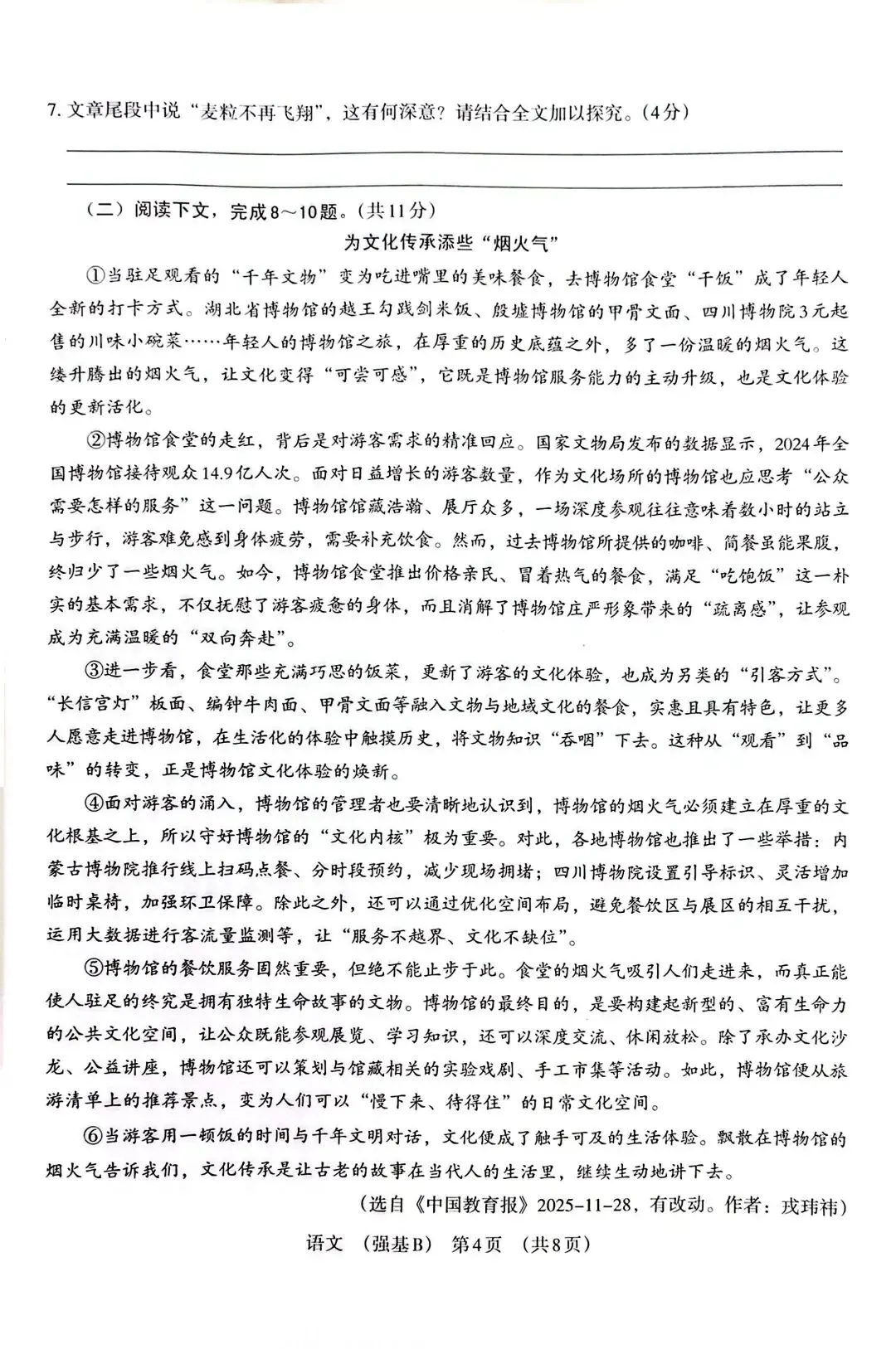 议论文《为文化传承添些“烟火气”》:紧扣“博物馆食堂走红”等社会热点,考查论证思路、举例论证与文本理解,贴近当下文化生活。