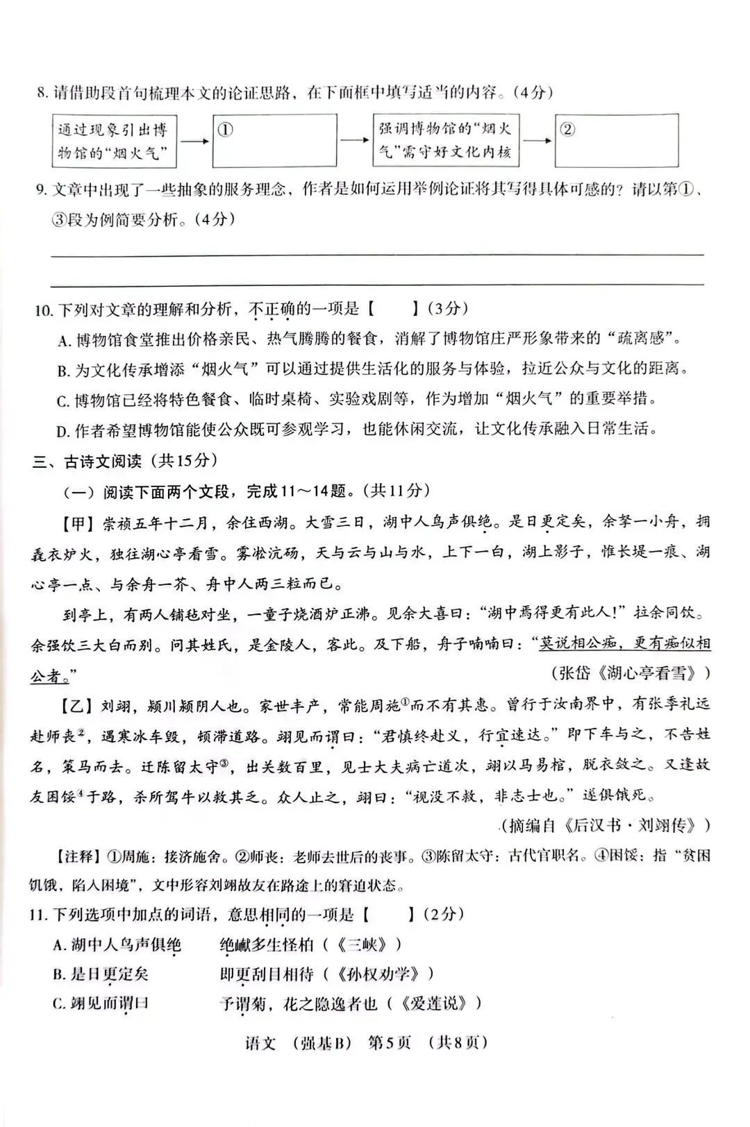 文言文:《湖心亭看雪》+《后汉书·刘翊传》对比阅读,考查文言实词、翻译、标点赏析与人物品格提炼。