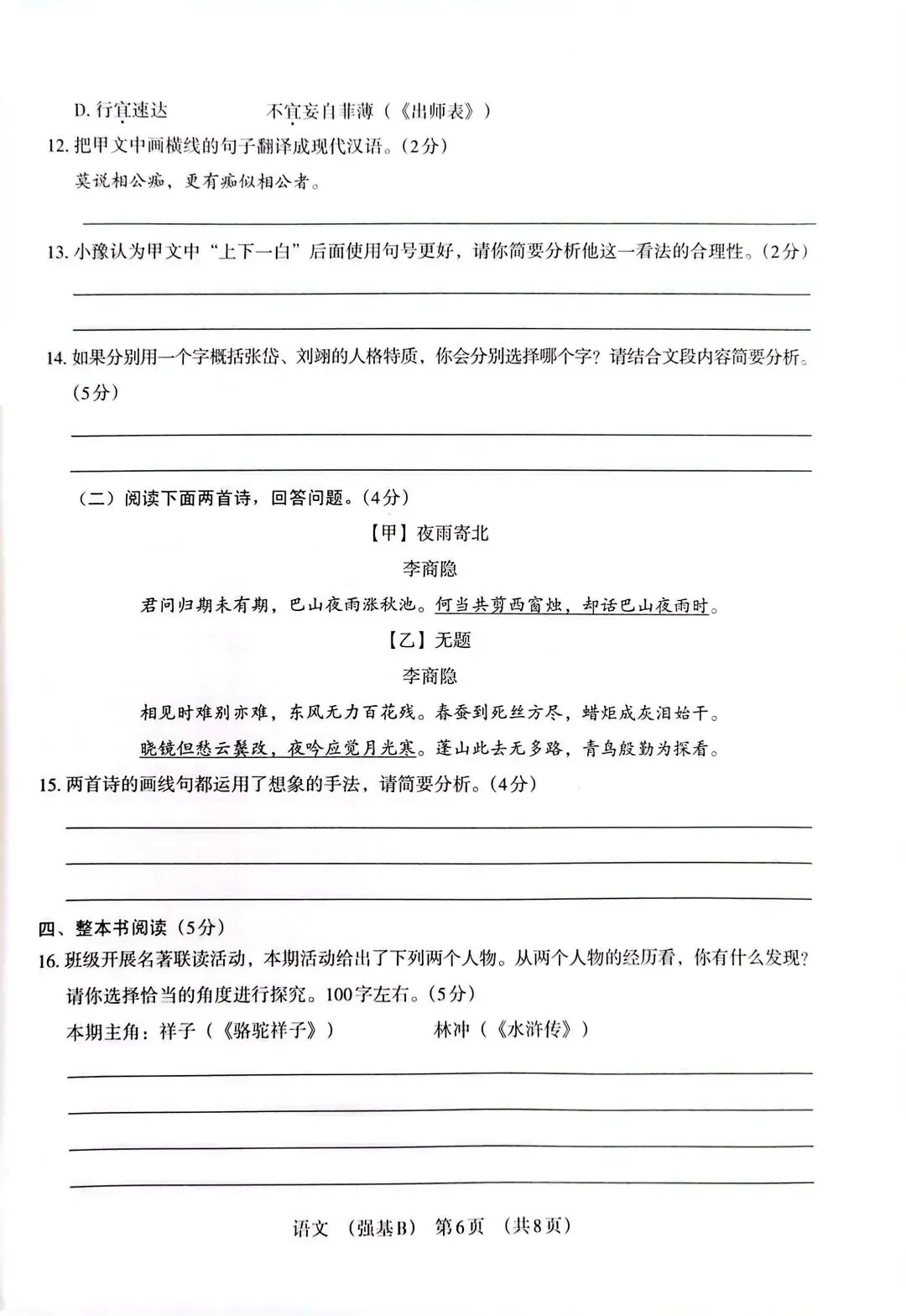 整本书阅读(5分):祥子与林冲的经历对比,引导学生从“命运轨迹”“性格转变”等角度探究经典人物的共性与差异。