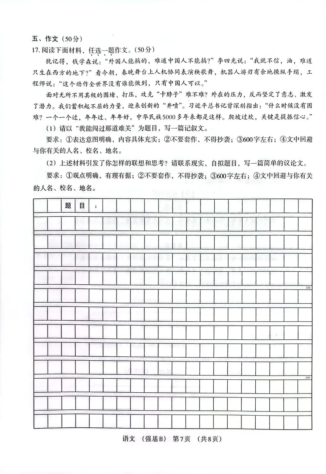 作文(50分):二选一模式,记叙文聚焦“闯关”的成长叙事,议论文围绕“攻坚克难、民族自信”展开,兼顾个人体验与家国情怀。