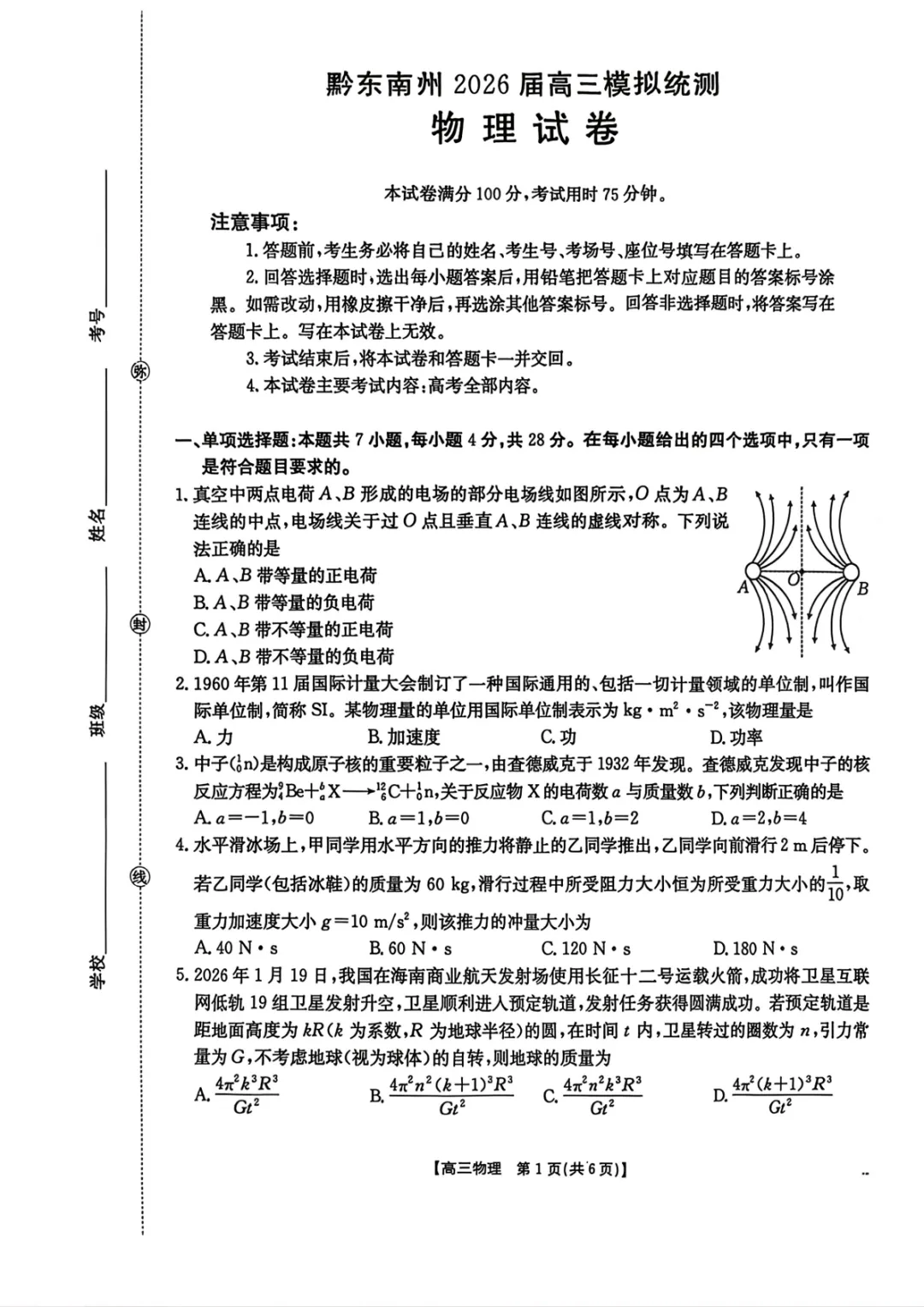 >2026届黔东南州高三一模物理试卷+答案(统测)