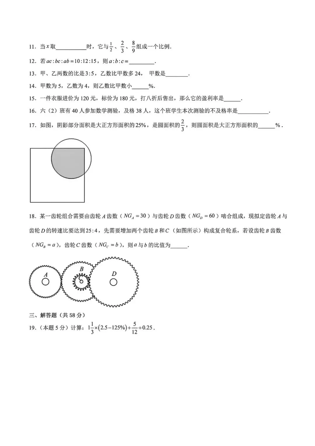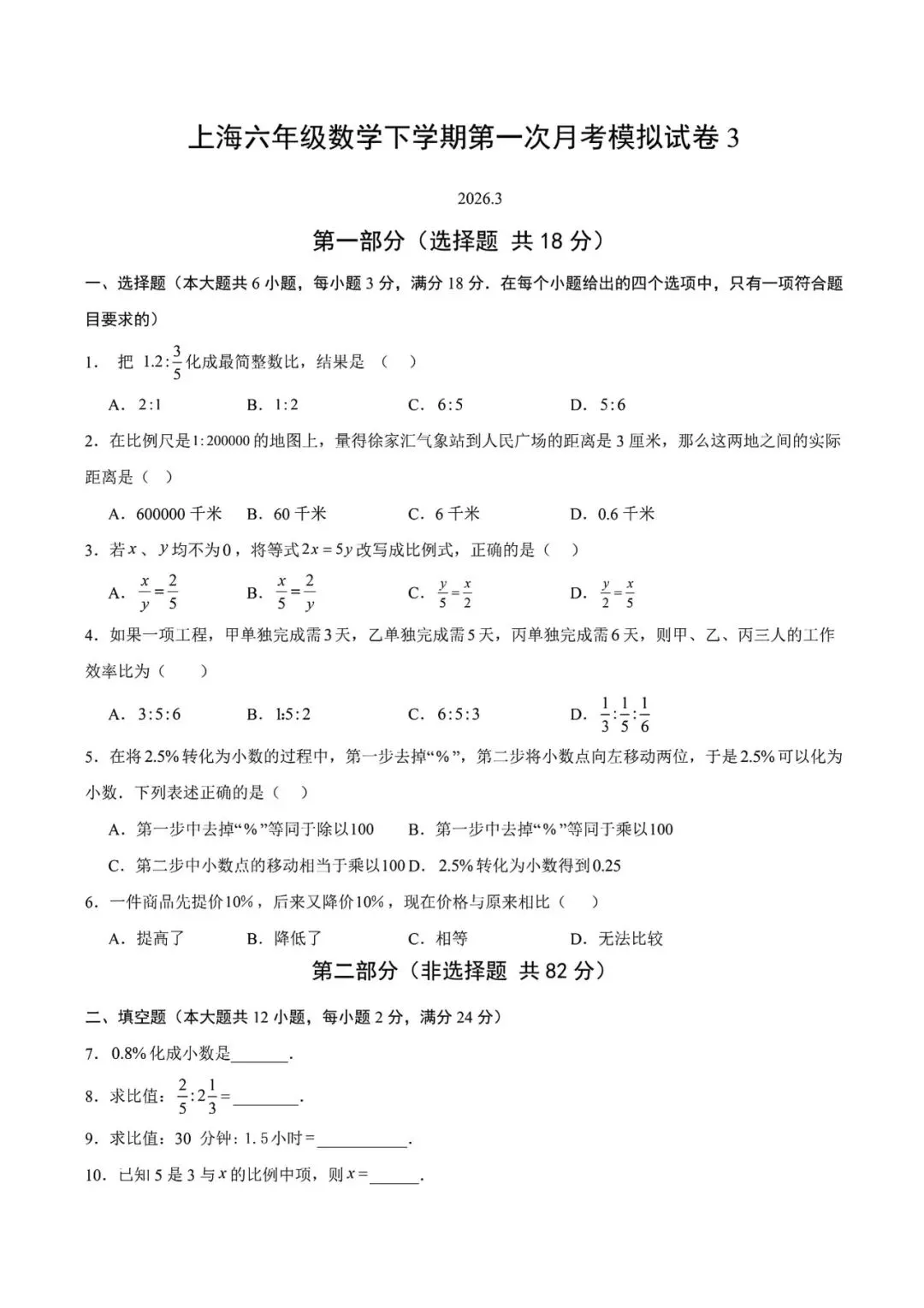 >上海市六年级下学期第一次月考数学模拟试卷3及答案(2026.3)