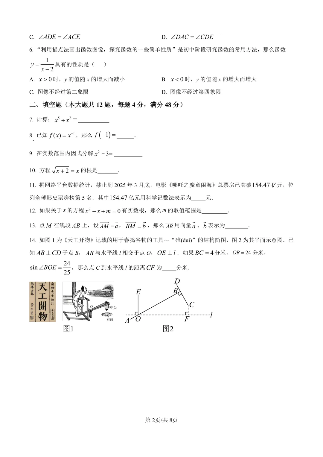 >2025届上海市奉贤区初三二模数学试卷(原卷版+解析版)