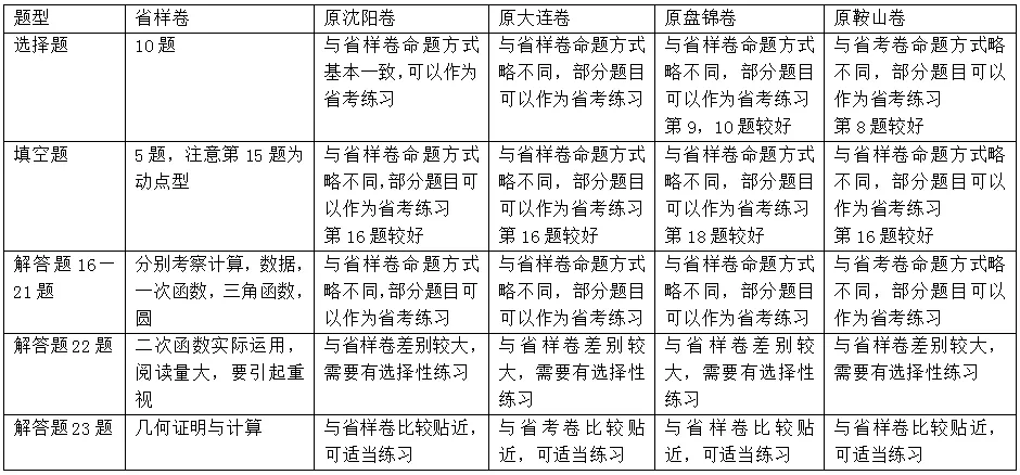 数学省样卷与沈阳/大连/盘锦/鞍山卷对比