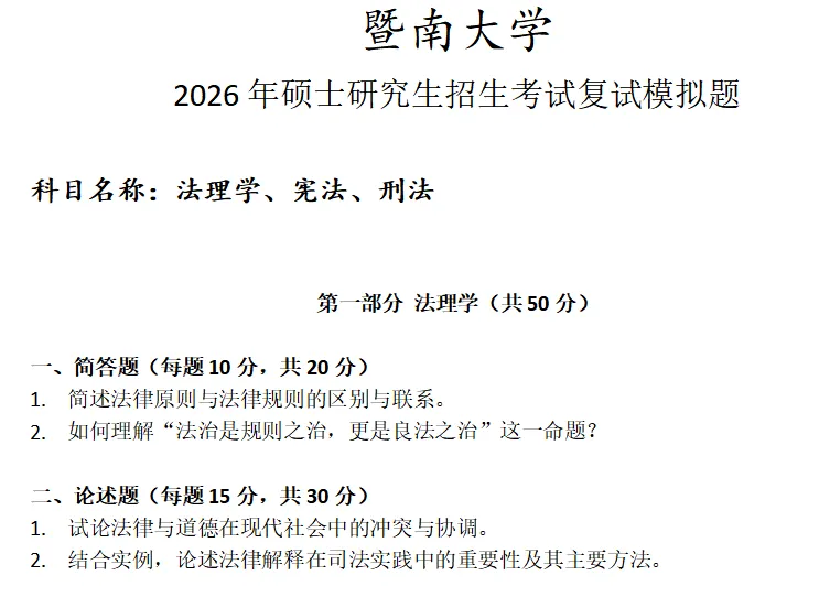当前位置:首页>考研真题>暨南大学法理学、宪法、刑法考研复试真题模拟