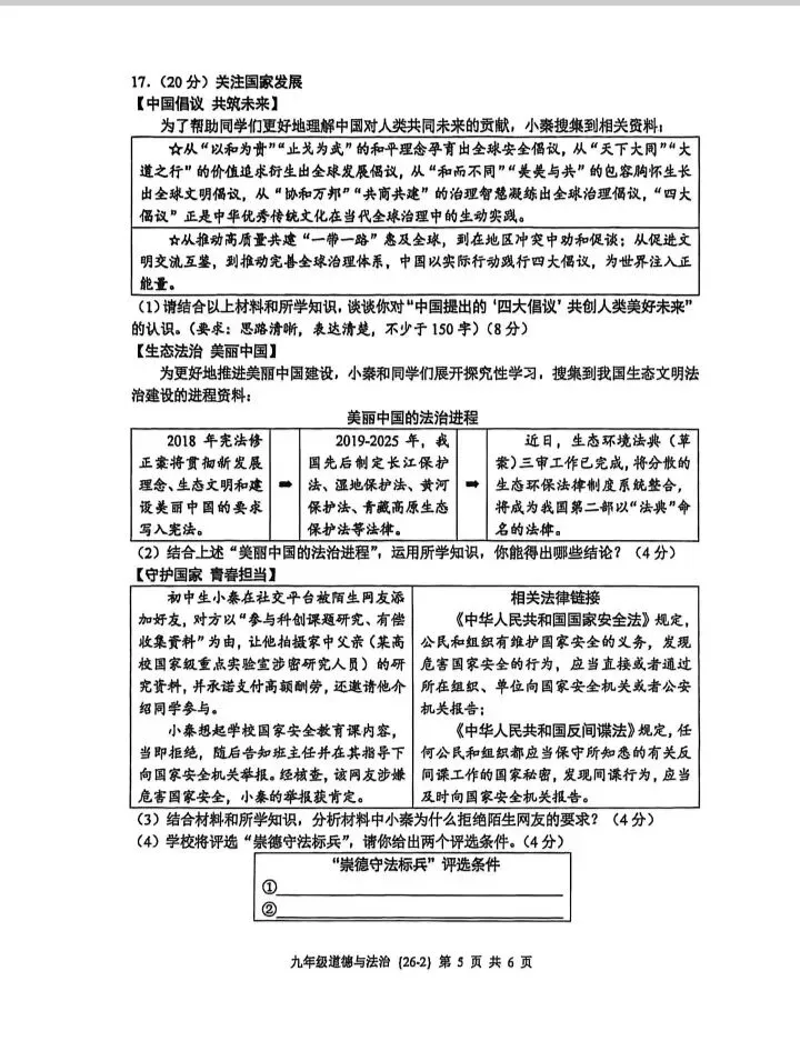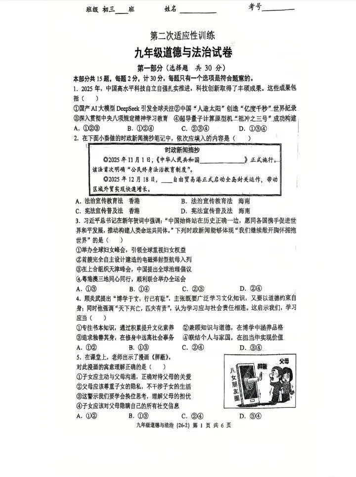 各位同学、家长朋友们,大家好,我是道法王老师,拥有十余年中考道法教学经验,专注方法技巧提分。接下来我将从命题特点、逐题解析、备考建议三个维度,对这套试卷进行全面深度解析,帮助大家精准把握考点、查漏补缺。
