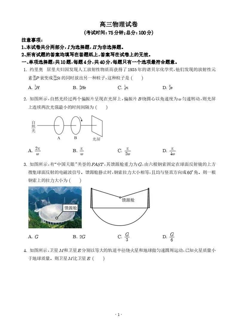 >【高一、高二、高三最新月考试卷】江苏泰州2026届高三下学期学情自测物理+答案