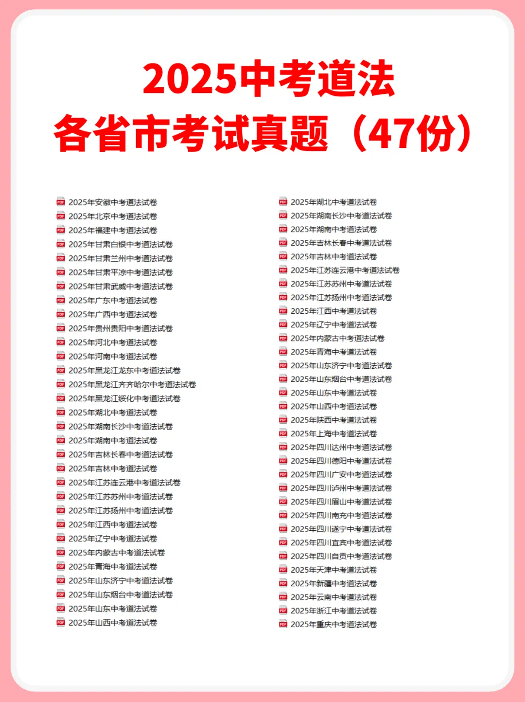 哈喽,我是苏苏,今天苏苏给大家分享的是:【全国地区】2025年中考道法考试真题(47份),电子版可下载可打印。 完整电子版文章末尾可直接领取,欢迎收藏和下载。领取方式: