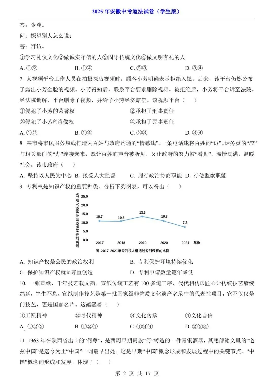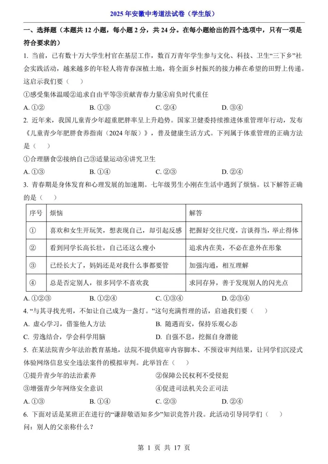 【全国地区】2025年中考道法考试真题(中考真题共计47份)- 电子版可打印~