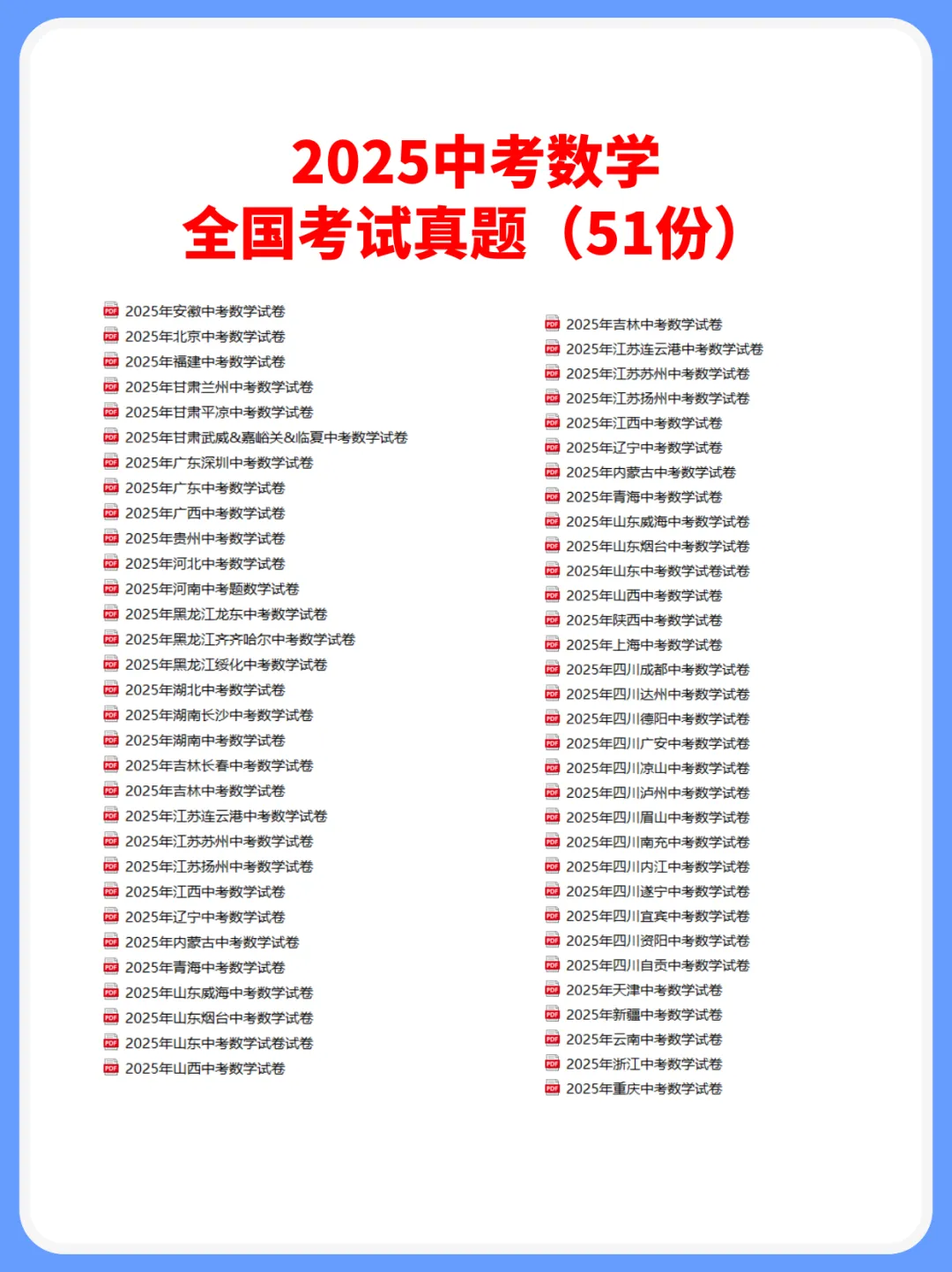 哈喽,我是苏苏,今天苏苏给大家分享的是:【全国地区】2025年中考数学考试真题(51份),电子版可下载可打印。 完整电子版文章末尾可直接领取,欢迎收藏和下载。