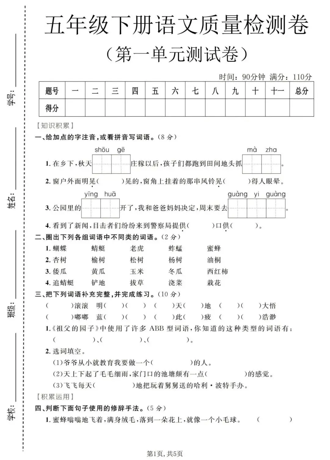 给大家分享:五年级下册人教版语文《第一单元检测试卷》,电子版可打印