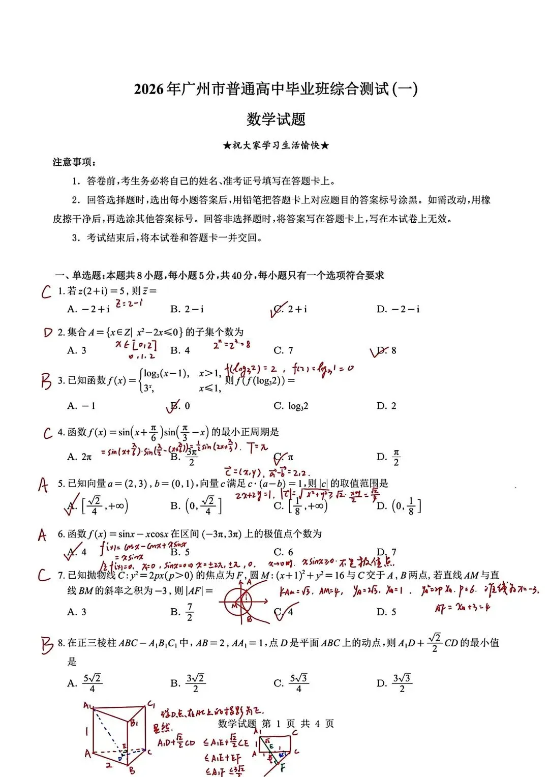 广州市2026届普通高中毕业班综合测试试卷及(一)答案汇总(无水印)