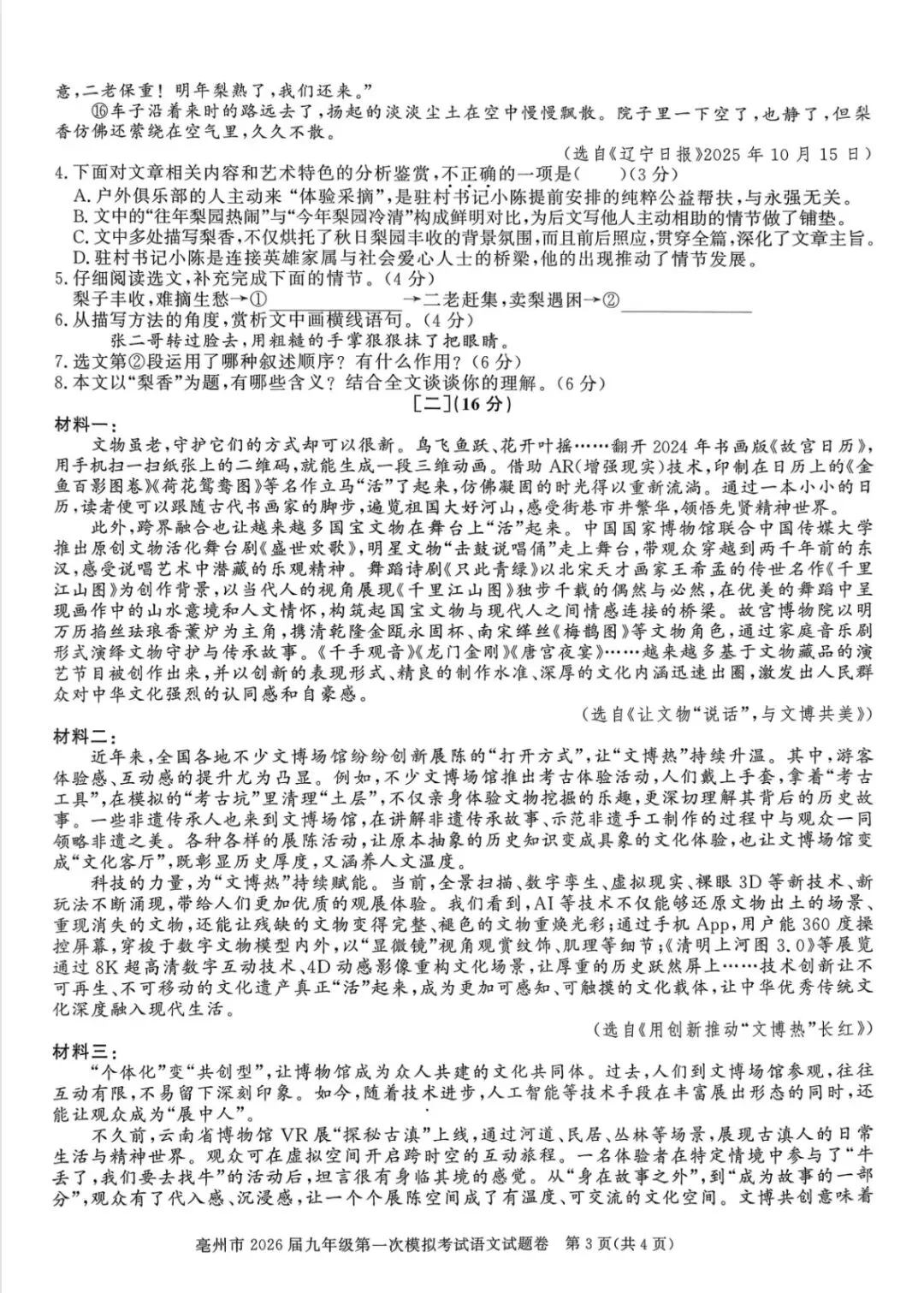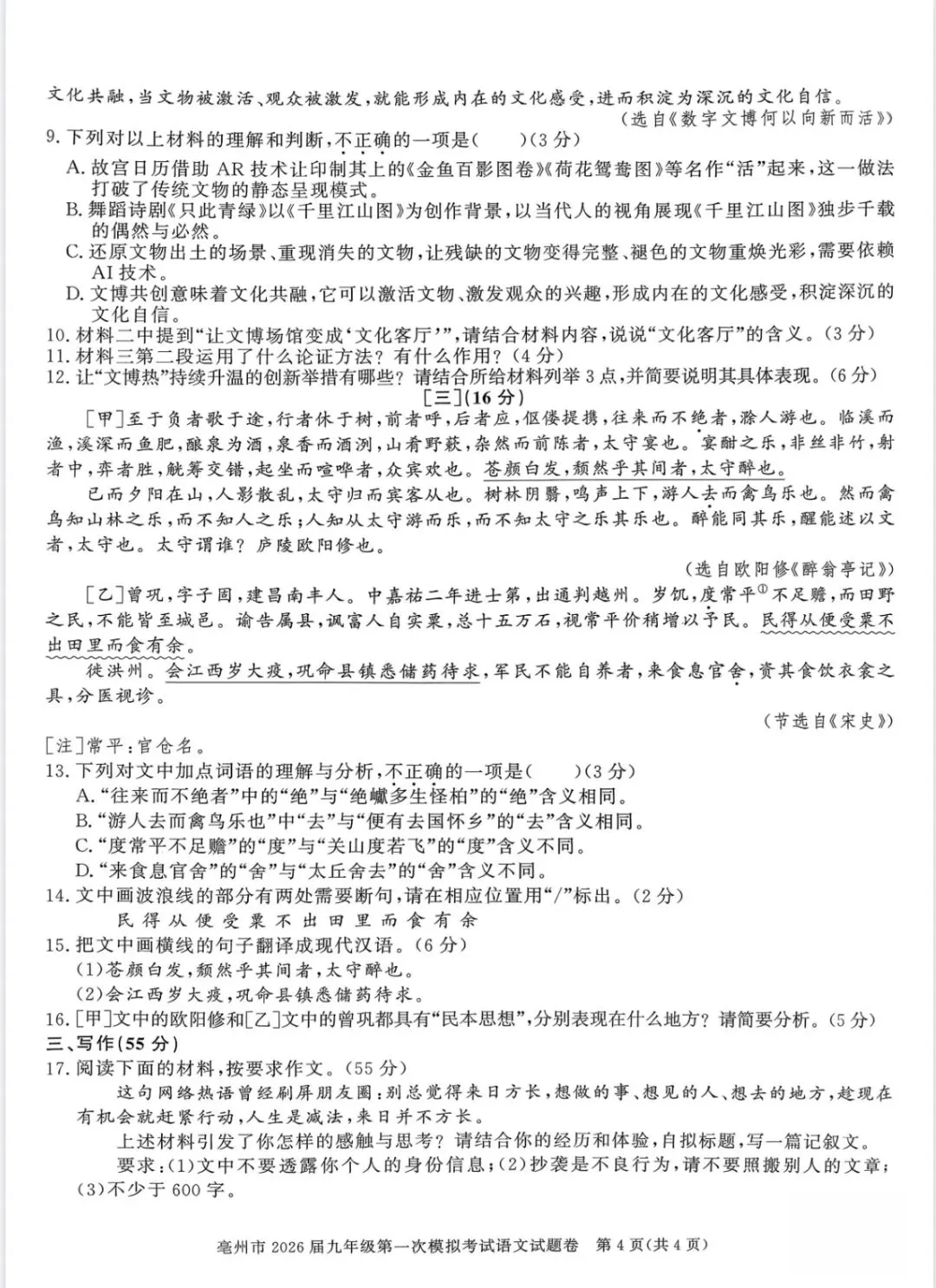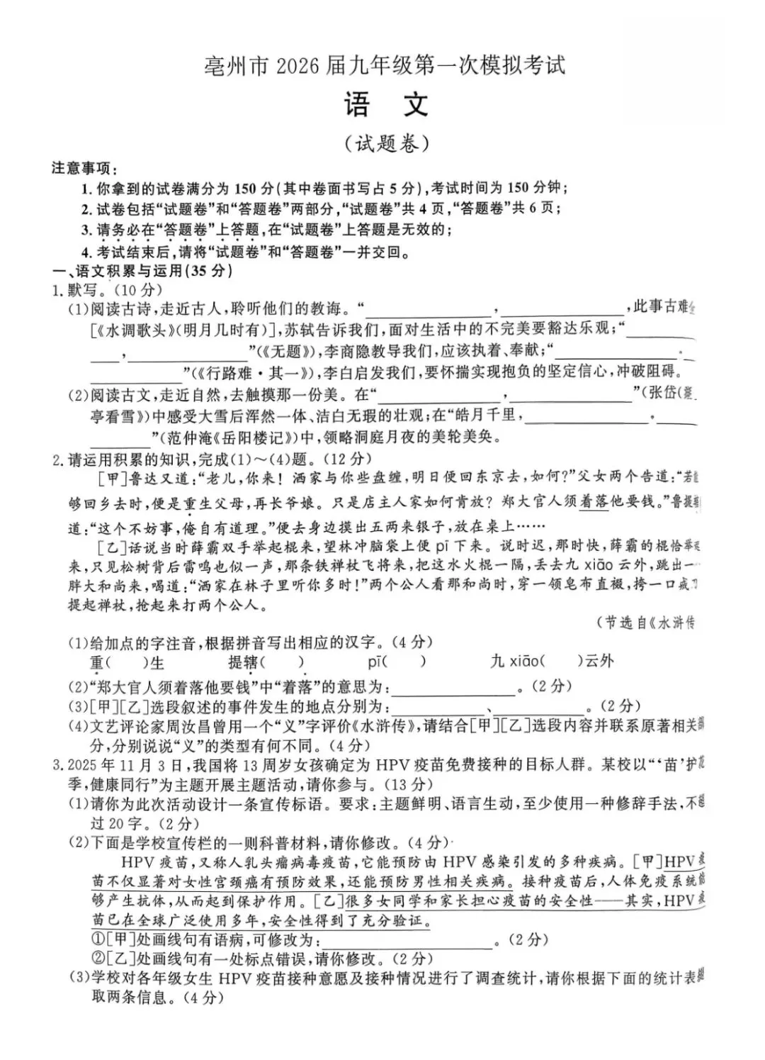 >亳州市2026届九年级一模语文试卷