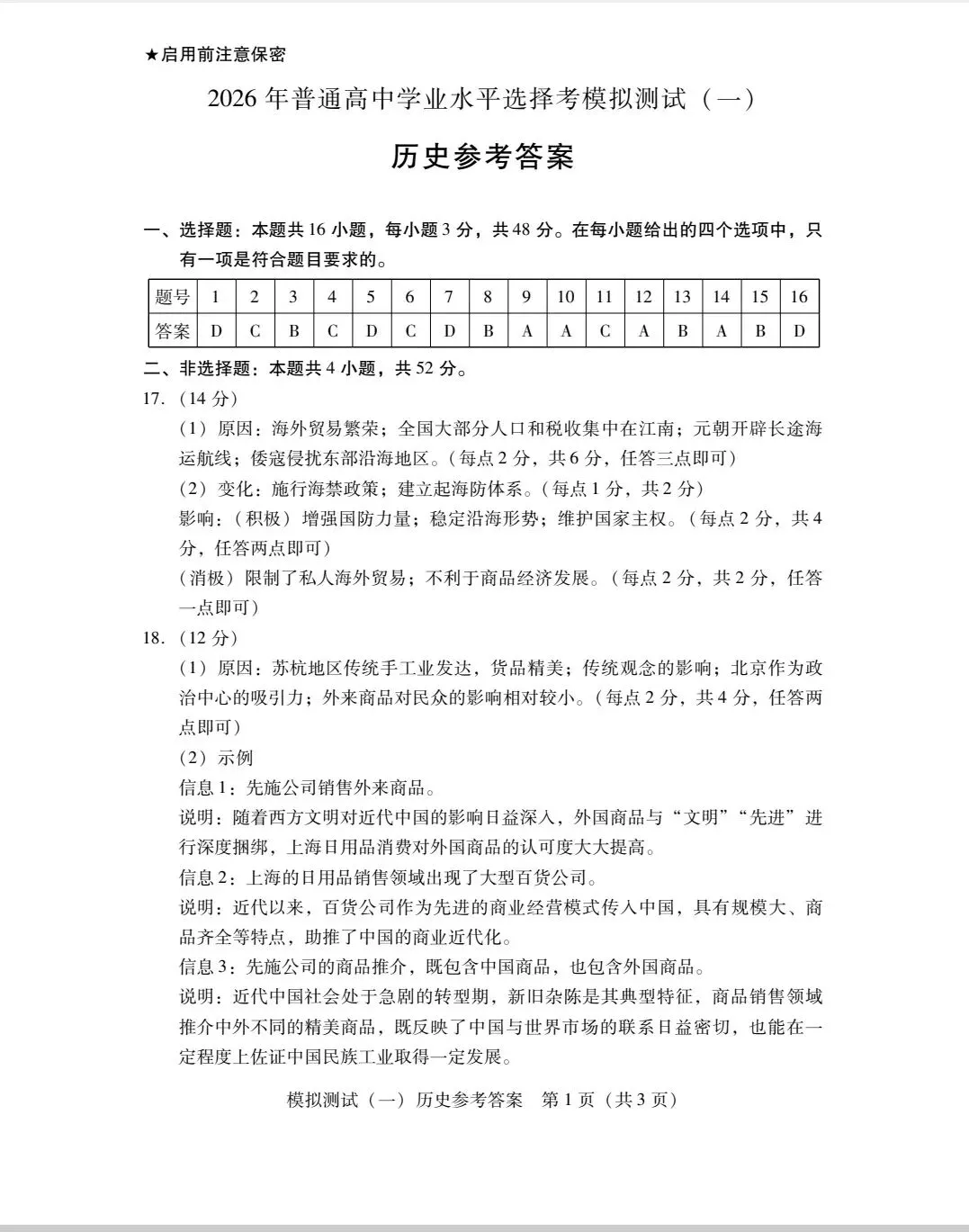 试卷分享丨 2026届苏锡常镇高三一模历史试卷真题及参考答案