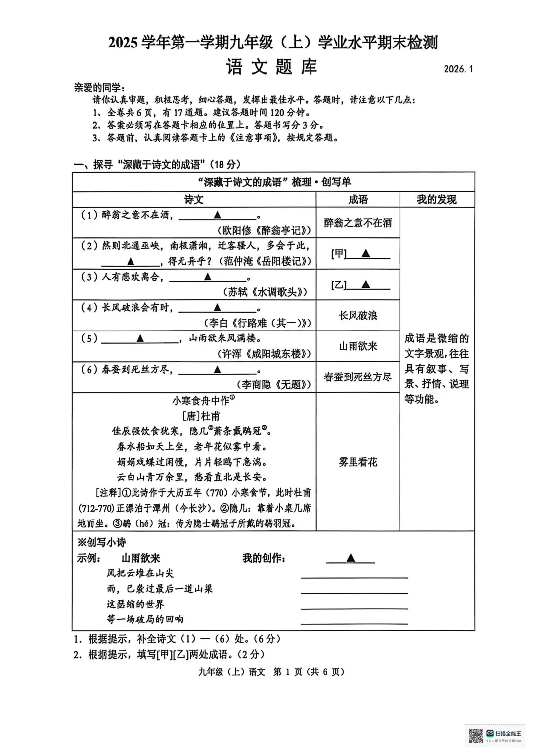 2.(2分)[甲]迁客骚人[乙]悲欢离合(或:阴晴圆缺)