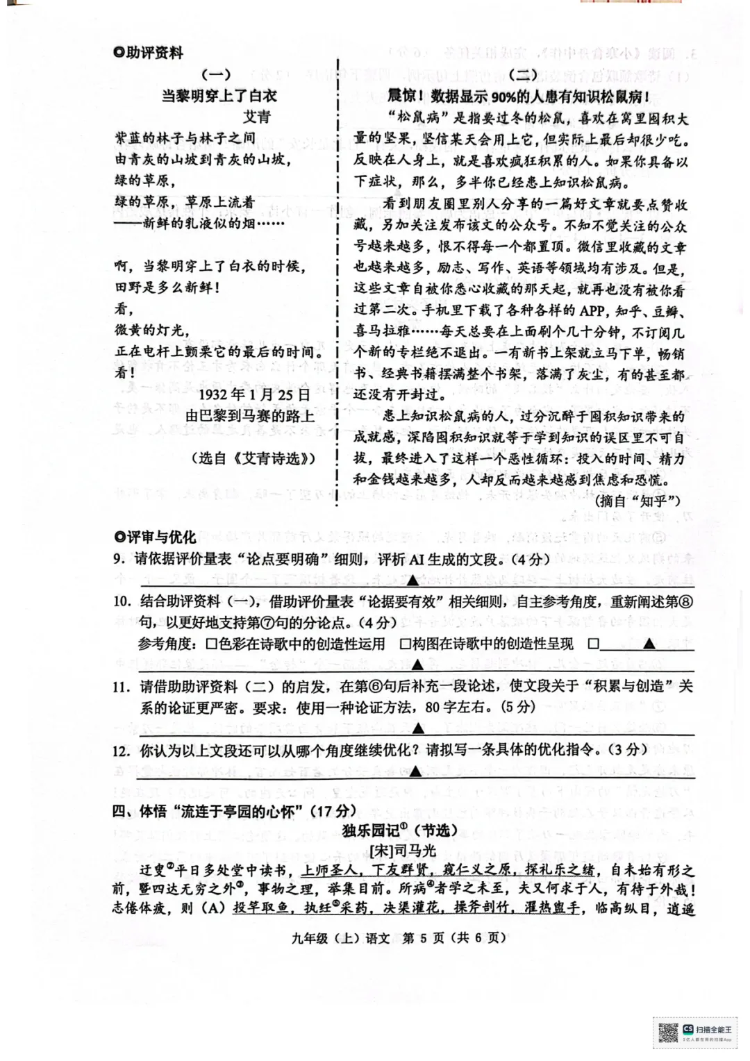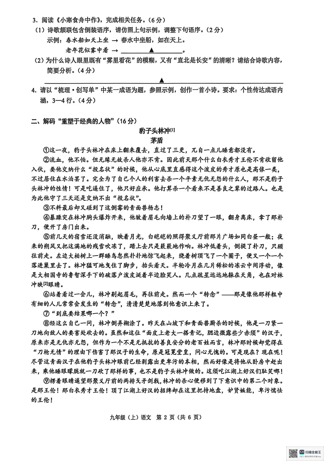 8.(5分)[示例]一、丰满人物形象:原著中林冲因被吴用等人挑动去火并王伦,是个被动的行动者。茅盾笔下的他先是因不忍加害无辜而拒交投名状,并且清晰地认识到王伦的狭隘自私,是兼具善良底色与大局观的觉醒者,形象更立体鲜活。二、深化思想主题:原著中的“火并王伦”是权力更迭性质的仇杀行为,本文中林冲欲杀王伦是对正义底线的坚守,对梁山“被压迫者圣地”的捍卫,主题更加深刻。三、折射时代诉求:本文创作于1930年革命浪潮中,茅盾借林冲的主动抉择,映射出对“正义且有理想的反抗者”的时代期待,以及对光明前景的深切渴盼。