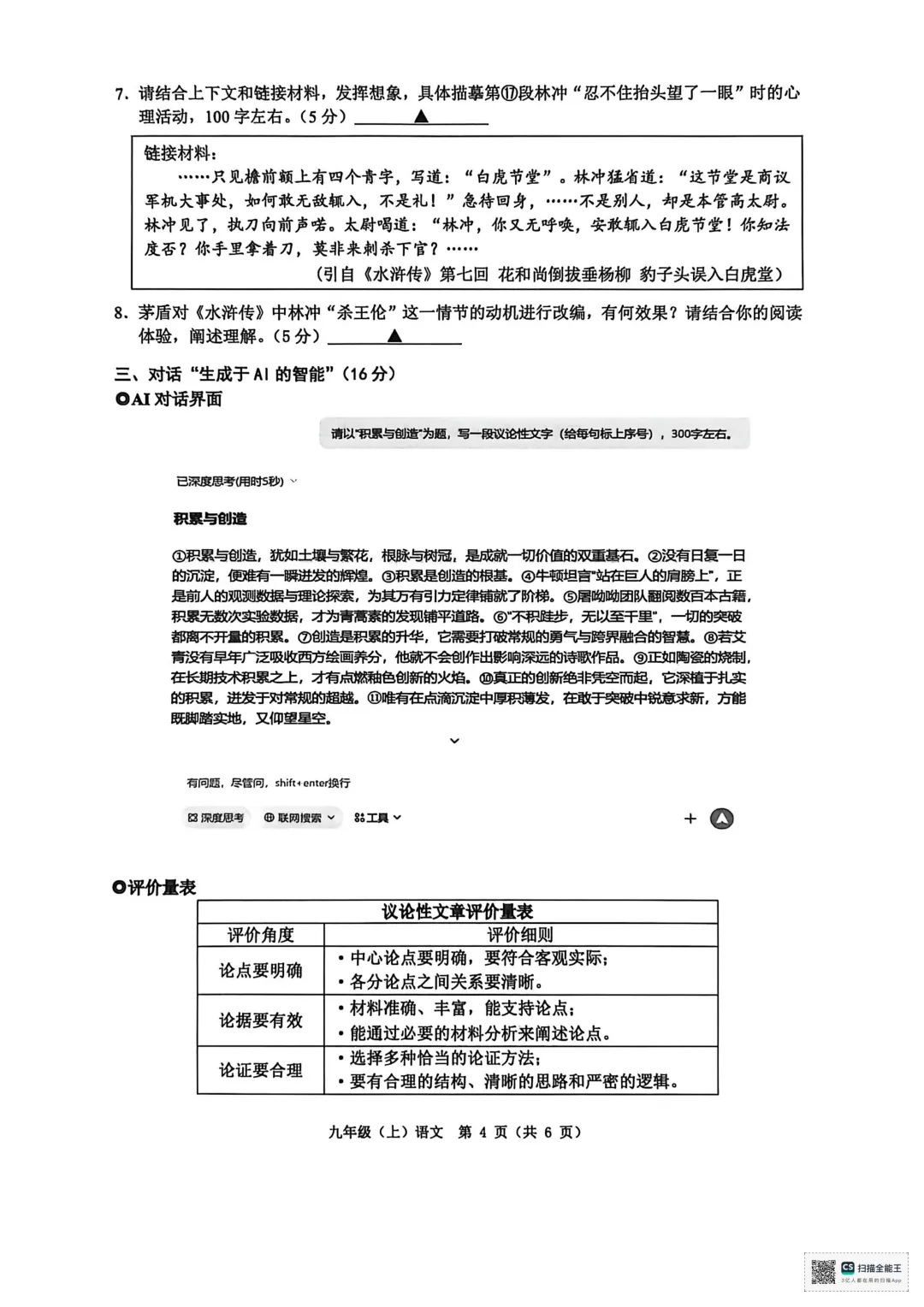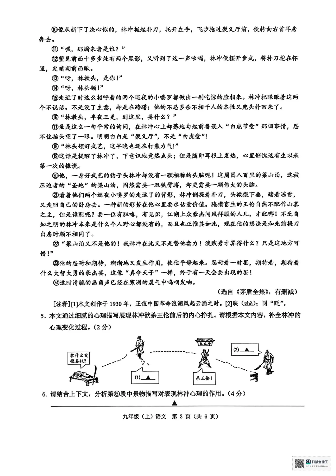 (评分细则:一空1分,意近即可。)6.(4分)用宿雪、朔风、冻云等冷寂肃杀的景物,烘托了林冲此时被迫去杀人的无奈痛苦的心境,投射出他决定屈从王伦时的压抑愤懑的心理。这些景物描写让林冲的挣扎与不甘变得可感可触,为他后续的心理转变埋下伏笔。
