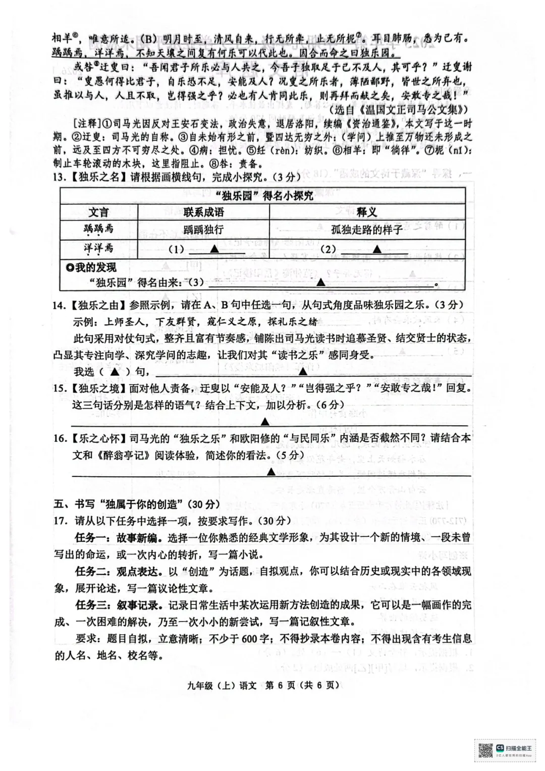 13.(3分)(1)洋洋得意(或“得意洋洋”“喜气洋洋”) (2)快乐得意的样子 (3)将“独”“乐”两字结合起来。
