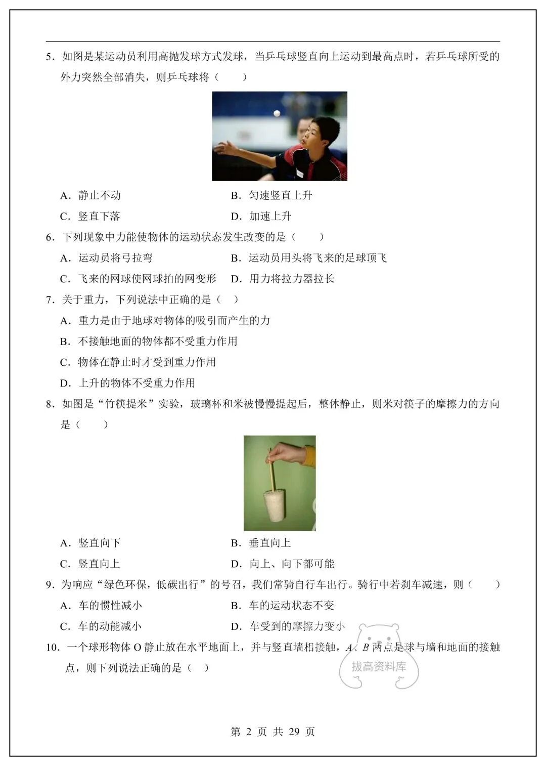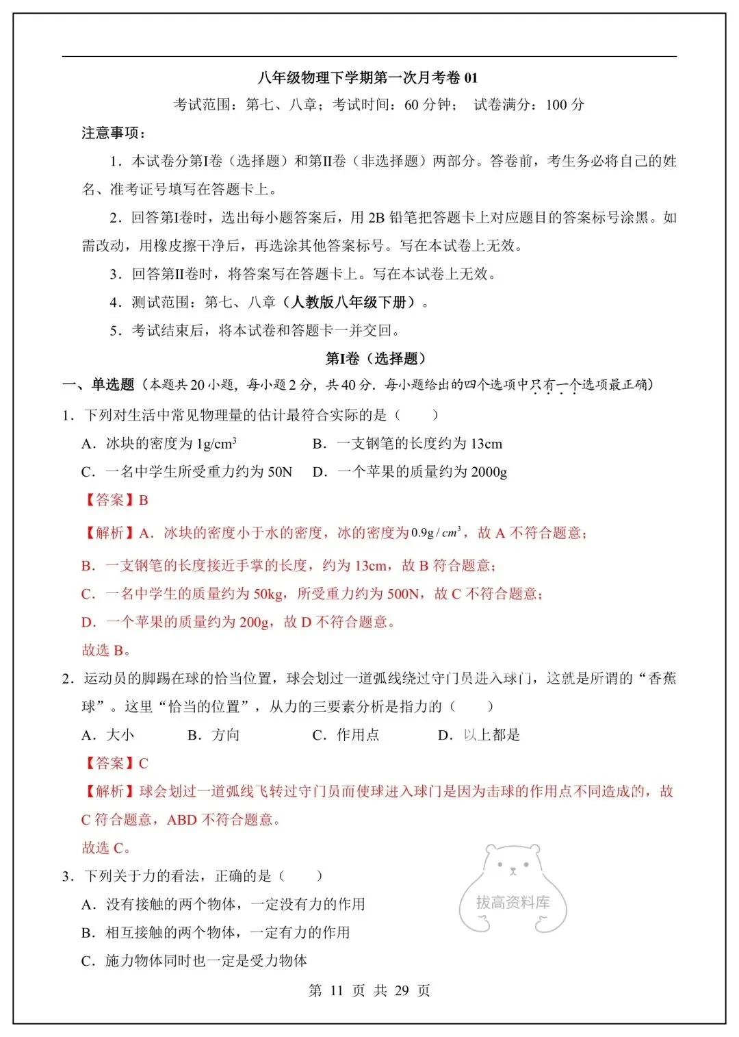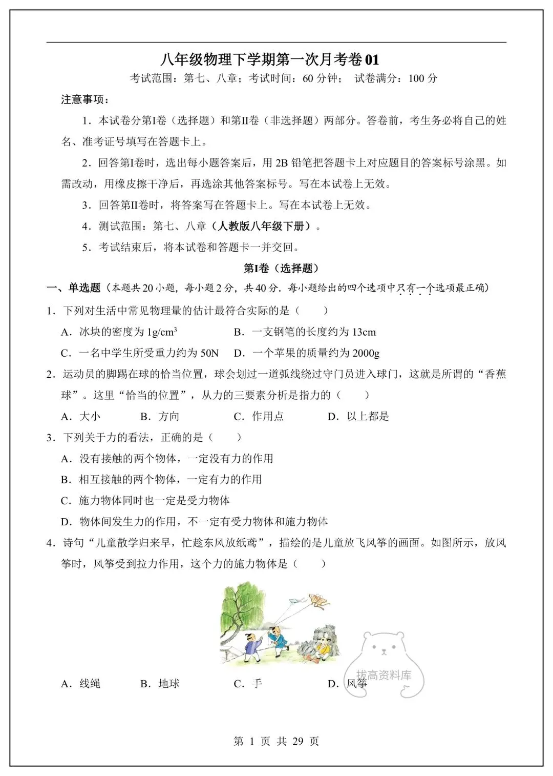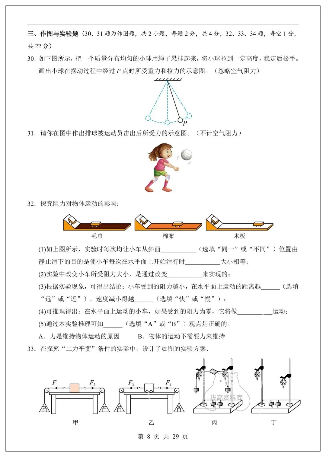 初二八年级物理下册第一次月考试卷+答案,电子版可打印!