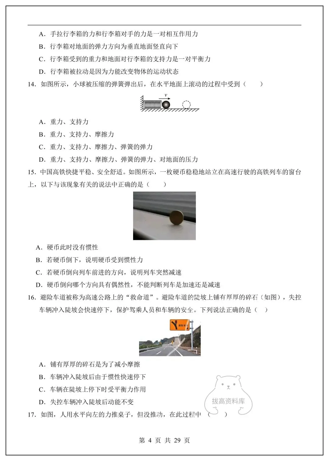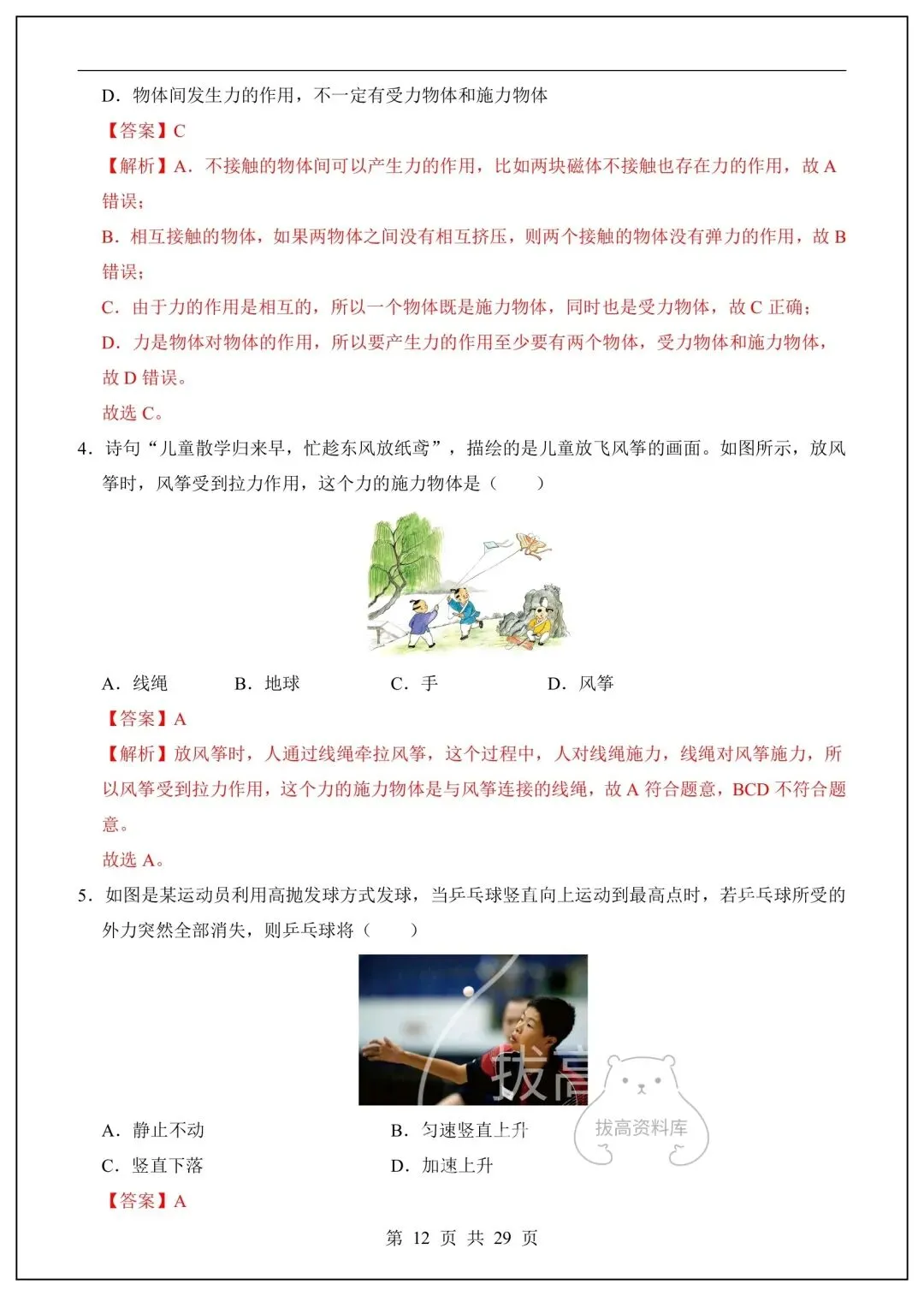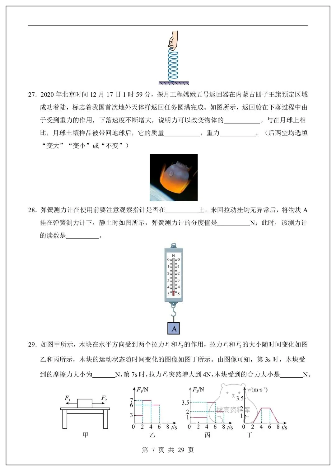 初二八年级物理下册第一次月考试卷+答案,电子版可打印!